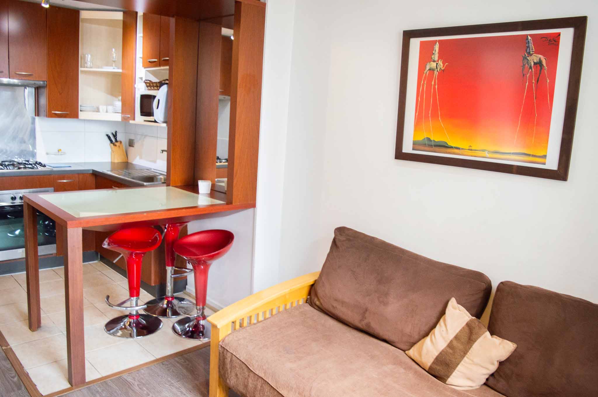 Departamento amoblado de 1 habitación ubicado a 2 minutos caminando de la parada de autobús y a 6 minutos caminando de la Estación de Metro Bellas Artes.El departamento tiene living, comedor, cocina (abierta), 1 baño y 1 estacionamiento (opcional por un valor de $ 88USD adicional). La habitación 1 tiene cama matrimonial, clóset, 2 mesas de noche y televisor; El lugar mide 35m² aproximadamente. Los gastos de servicios de gastos comunes, agua caliente, agua fría, electricidad, gas, internet y TV cable se pagan por adelantado junto a la renta mensual, con un límite de consumo de $ 176USD. El alojamiento tiene lavandería compartida cuyo valor es $ 2USD aproximadamente por carga de ropa (lavado o secado). Se debe pagar garantía (depósito) la que será devuelta al finalizar el período de arriendo; además, se debe pagar $ 33USD al momento de devolver el alojamiento para realizar la limpieza del lugar. Cerca del alojamiento se encuentra el Barrio Lastarria y Barrio Bellas Artes (barrios históricos - culturales), caracterizados por sus casonas del siglo XIX restauradas y utilizadas como restaurantes, cafeterías, librerías, centros culturales, entre otros. A pasos podrás encontrar el Museo Nacional de Bellas Artes, donde se resguarda lo más valioso del arte nacional e internacional y el Parque Forestal, lugar ideal para compartir con amigos, practicar deportes y pasear.