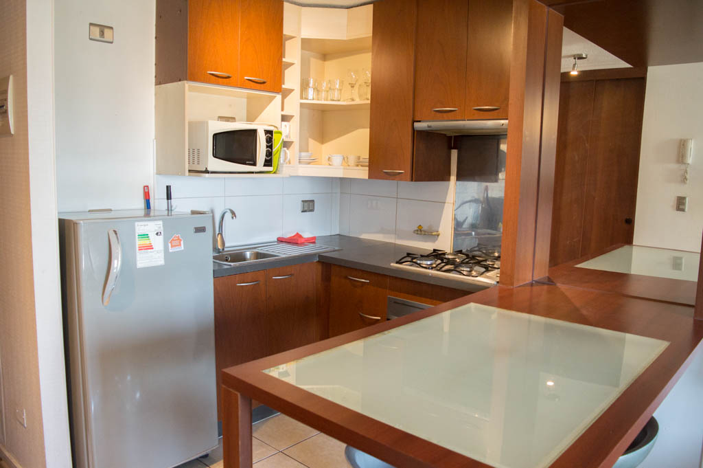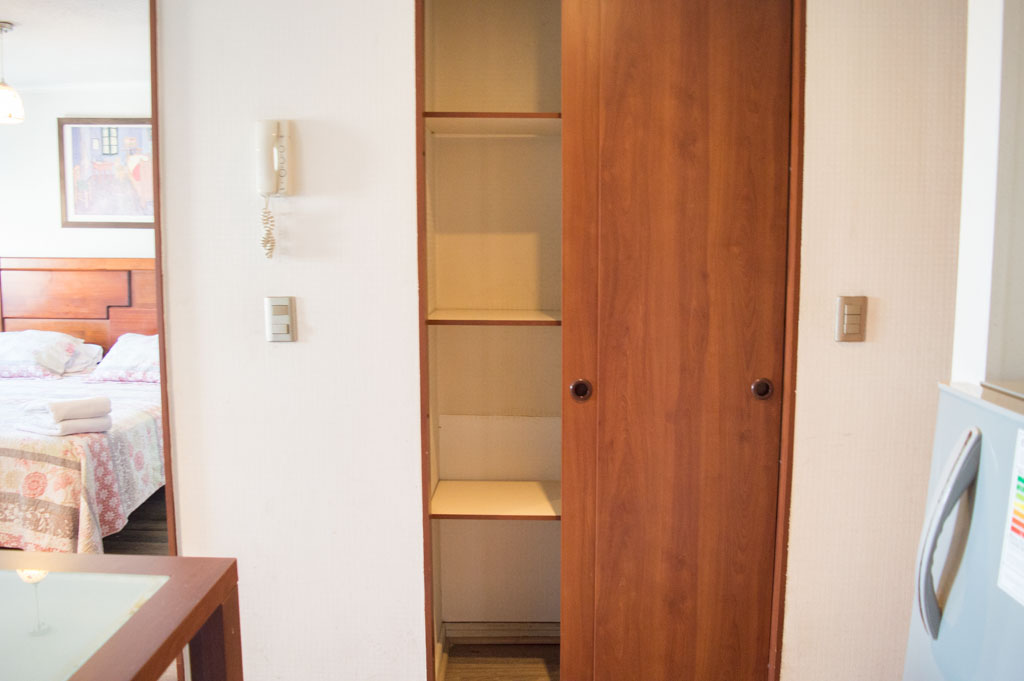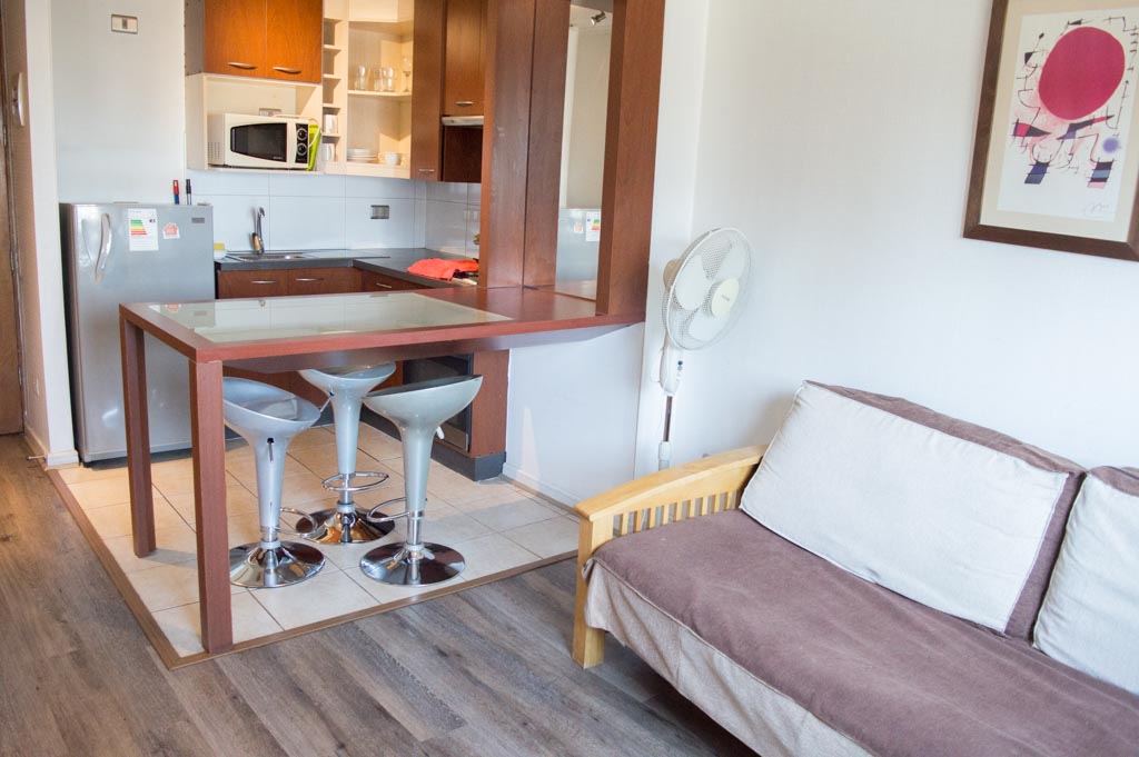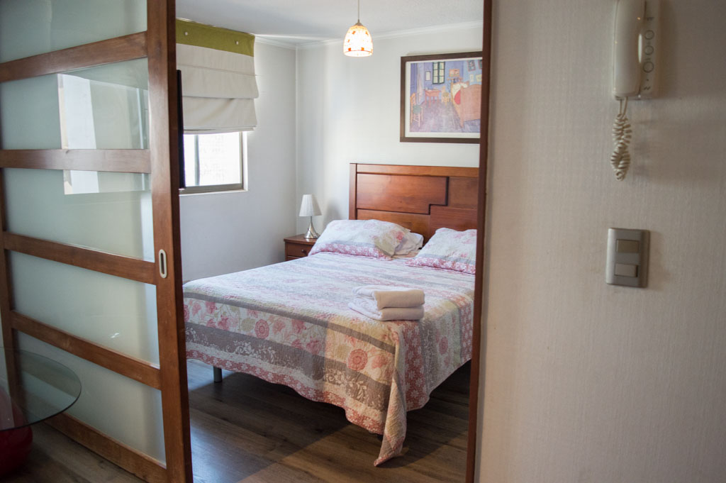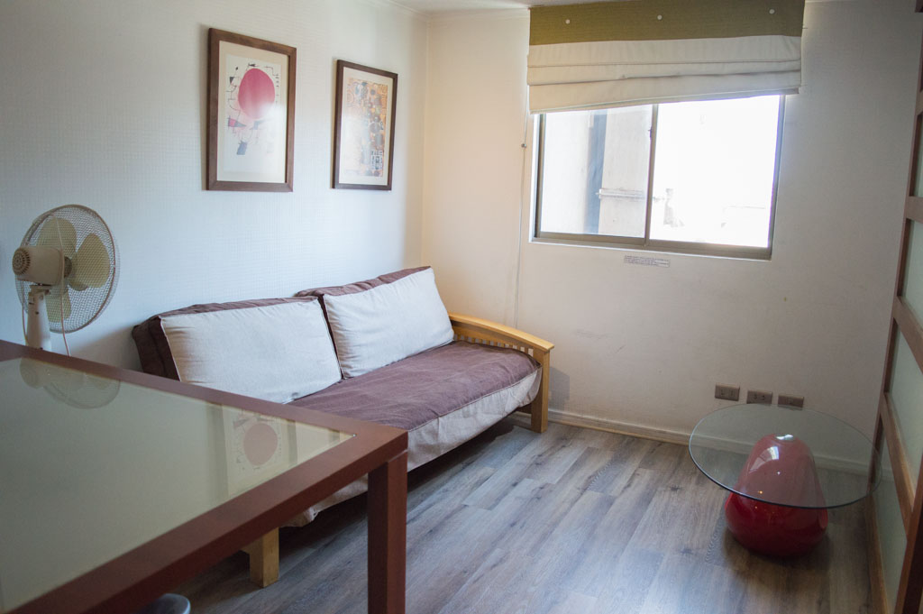 Departamento amoblado de 1 habitación ubicado a 2 minutos caminando de la parada de autobús y a 6 minutos caminando de la Estación de Metro Universidad de Chile.El departamento tiene living, comedor, cocina (abierta) y 1 baño. La habitación 1 tiene cama matrimonial, clóset, 2 mesas de noche, televisor y baño en suite; El lugar mide 35m² aproximadamente. Los gastos de servicios de gastos comunes, agua caliente, agua fría, electricidad, gas, internet y TV cable se pagan por adelantado junto a la renta mensual, con un límite de consumo de $ 185USD. El alojamiento tiene lavandería compartida cuyo valor es $ 2USD aproximadamente por carga de ropa (lavado o secado). Se debe pagar garantía (depósito) la que será devuelta al finalizar el período de arriendo; además, se debe pagar $ 35USD al momento de devolver el alojamiento para realizar la limpieza del lugar. Cerca del alojamiento se encuentra la Avenida Bernardo O'Higgins (más conocida como Alameda) donde hay diversos locales comerciales, gran variedad de transporte público y el centro cívico de Santiago. A pasos del metro se encuentra el emblemático Instituto Nacional José Miguel Carrera, la Universidad de Chile y el Teatro Municipal de Santiago.