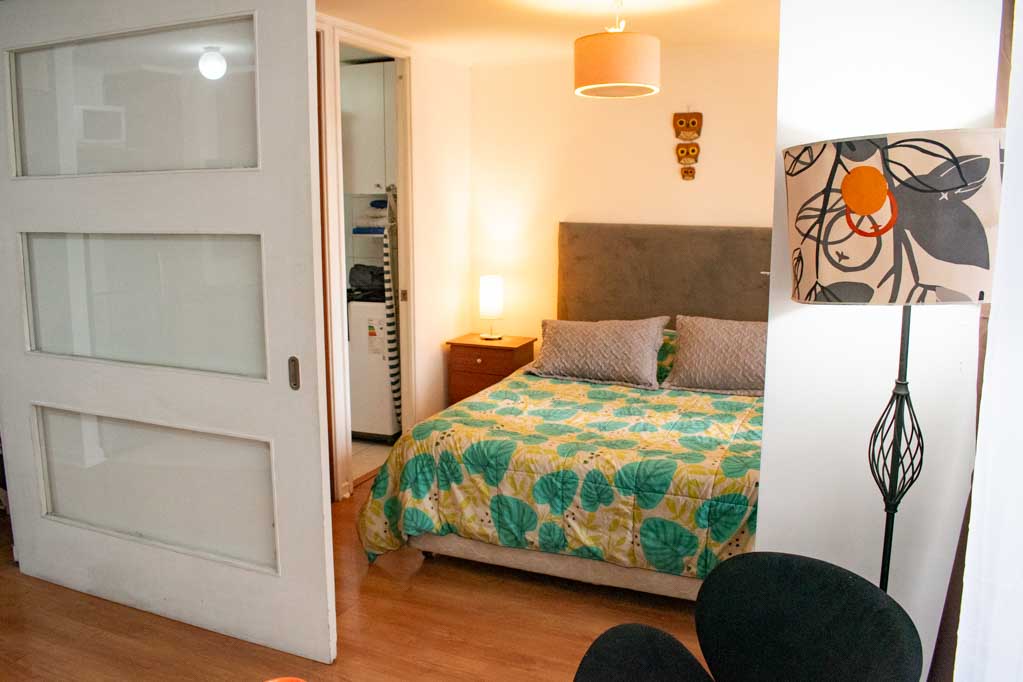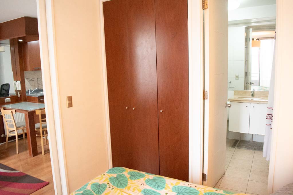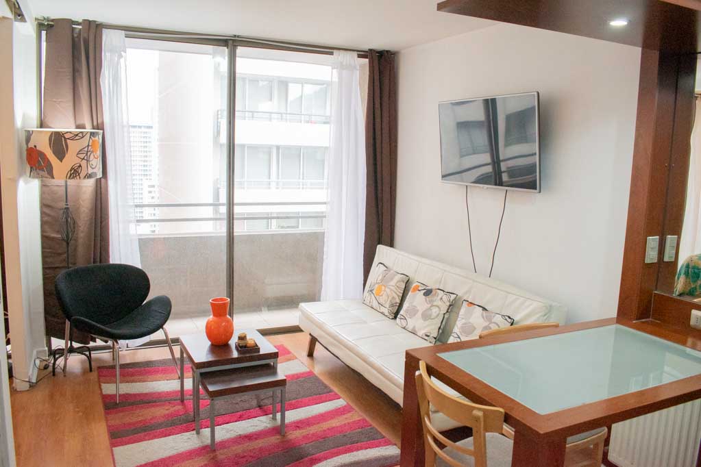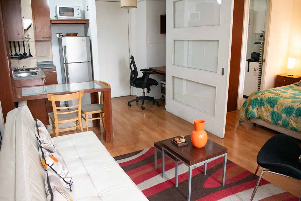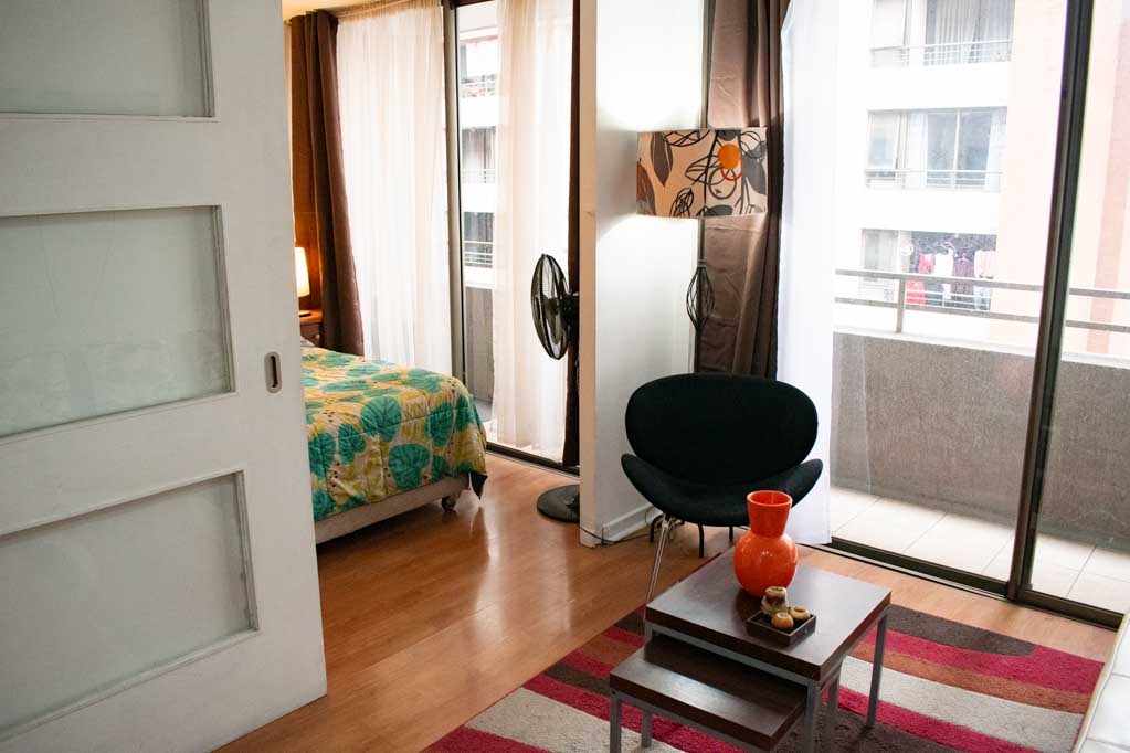 Departamento amoblado de 1 habitación ubicado a 2 minutos caminando de la parada de autobús y a 5 minutos caminando de la Estación de Metro Plaza de Armas.El departamento tiene living, comedor, cocina (abierta), 1 baño y terraza. La habitación 1 tiene cama matrimonial, clóset, 2 mesas de noche, televisor y baño en suite; El lugar mide 35m² + 2m² de terraza aproximadamente. Los gastos de servicios de gastos comunes, agua caliente, agua fría, electricidad e internet se pagan por adelantado junto a la renta mensual, con un límite de consumo de $ 141USD. El alojamiento tiene lavandería compartida cuyo valor es $ 2USD aproximadamente por carga de ropa (lavado o secado). Se debe pagar garantía (depósito) la que será devuelta al finalizar el período de arriendo; además, se debe pagar $ 43USD al momento de devolver el alojamiento para realizar la limpieza del lugar. Cerca del alojamiento se encuentra la Plaza de Armas de Santiago, parte importante del casco histórico de la ciudad, reconocida por su arquitectura e infraestructuras, tales como el Correo de Santiago, Catedral de Santiago, Municipalidad y la Casa Colorada. Este lugar, tiene buen acceso y conectividad con varios puntos de la ciudad. El sector se caracteriza por concentrar variadas instituciones de servicios públicos y privados.