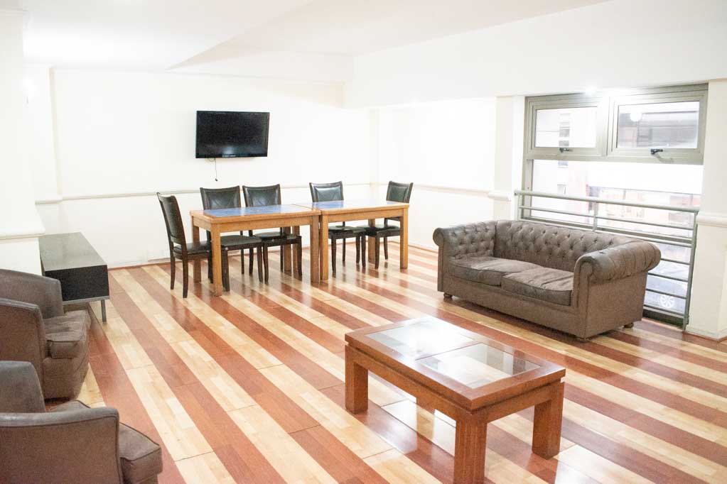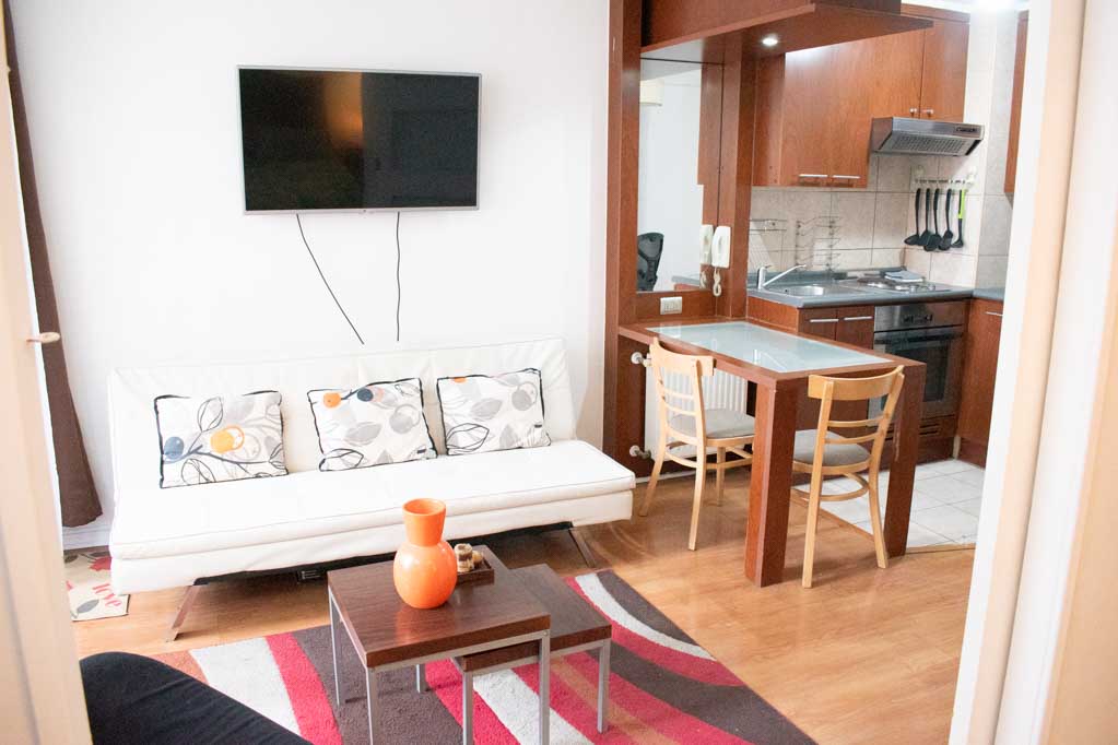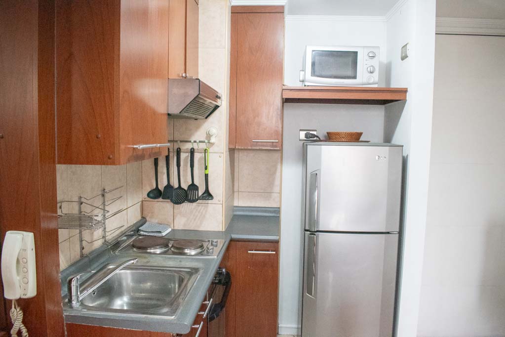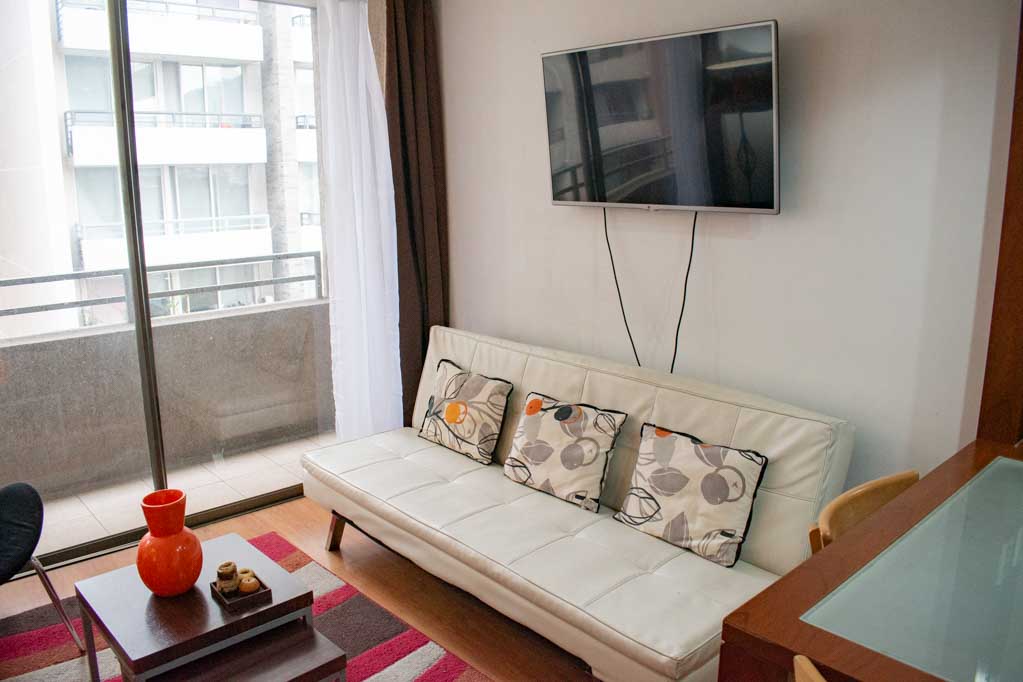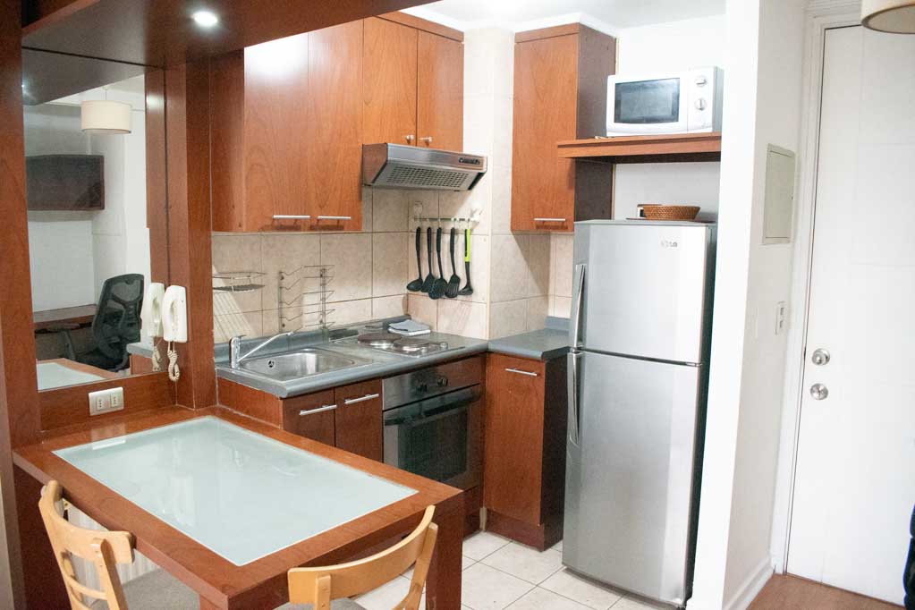 Departamento amoblado de 1 habitación ubicado a 2 minutos caminando de la parada de autobús y a 5 minutos caminando de la Estación de Metro Plaza de Armas.El departamento tiene living, comedor, cocina (abierta), 1 baño y terraza. La habitación 1 tiene cama matrimonial, clóset, 2 mesas de noche, televisor y baño en suite; El lugar mide 35m² + 2m² de terraza aproximadamente. Los gastos de servicios de gastos comunes, agua caliente, agua fría, electricidad e internet se pagan por adelantado junto a la renta mensual, con un límite de consumo de $ 141USD. El alojamiento tiene lavandería compartida cuyo valor es $ 2USD aproximadamente por carga de ropa (lavado o secado). Se debe pagar garantía (depósito) la que será devuelta al finalizar el período de arriendo; además, se debe pagar $ 43USD al momento de devolver el alojamiento para realizar la limpieza del lugar. Cerca del alojamiento se encuentra la Plaza de Armas de Santiago, parte importante del casco histórico de la ciudad, reconocida por su arquitectura e infraestructuras, tales como el Correo de Santiago, Catedral de Santiago, Municipalidad y la Casa Colorada. Este lugar, tiene buen acceso y conectividad con varios puntos de la ciudad. El sector se caracteriza por concentrar variadas instituciones de servicios públicos y privados.