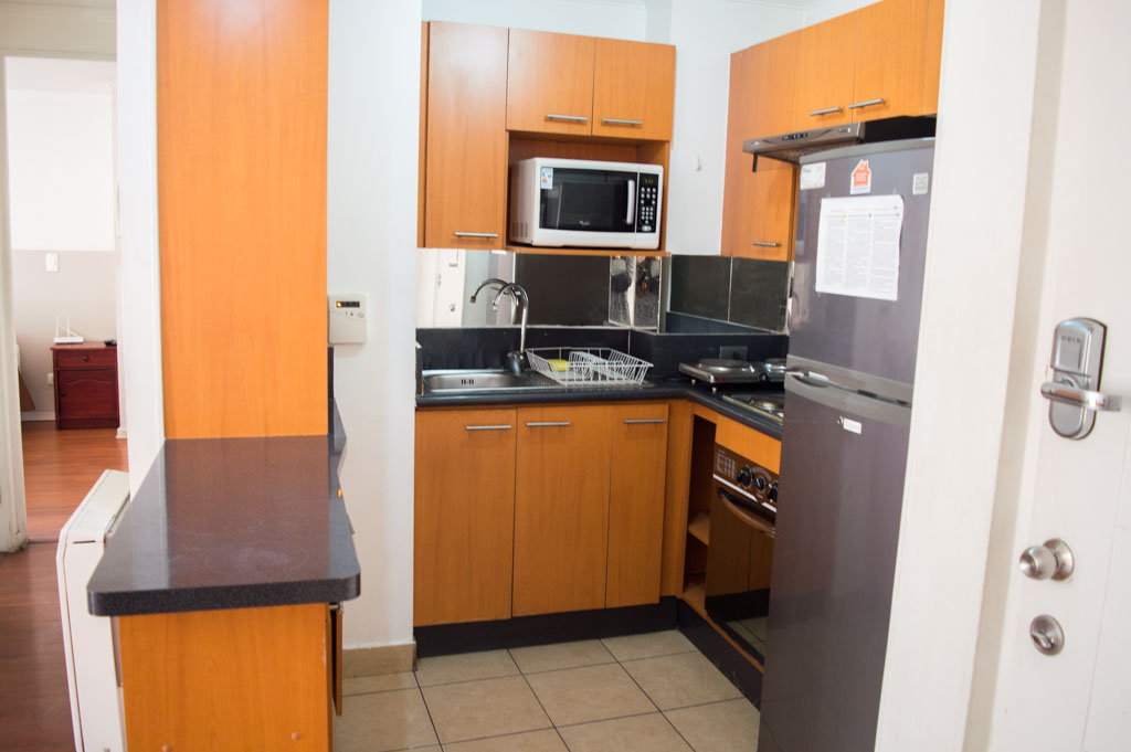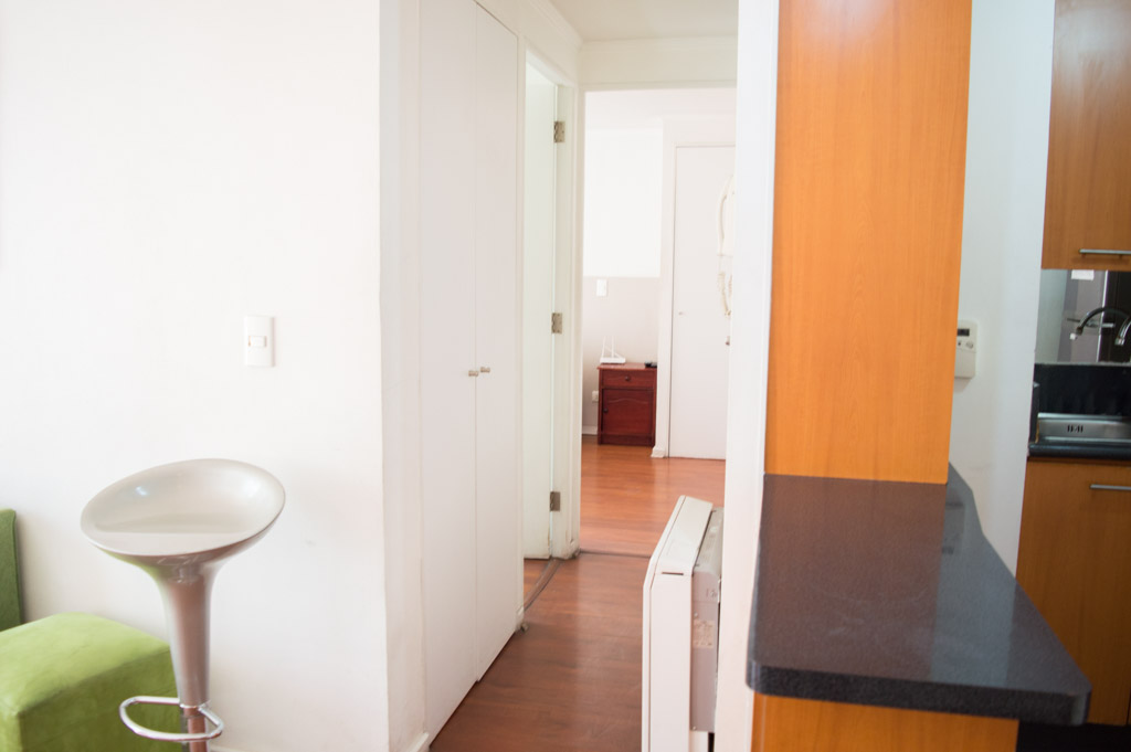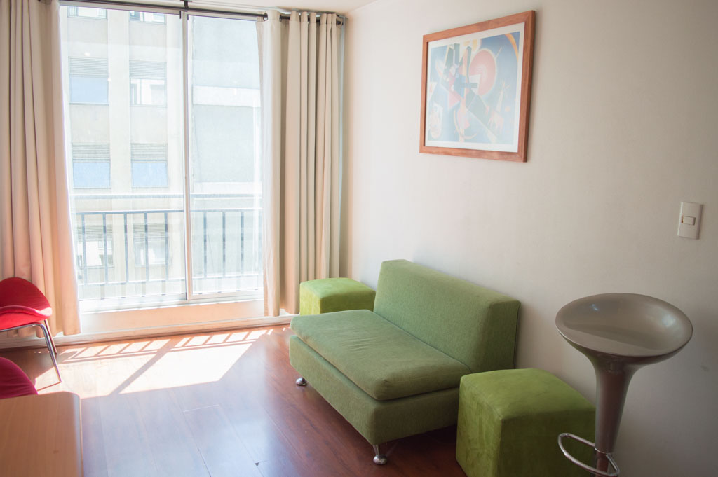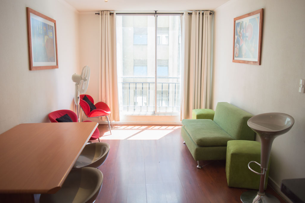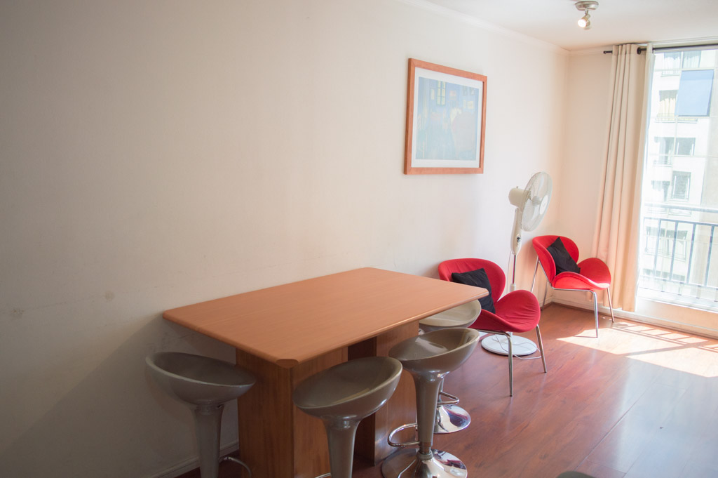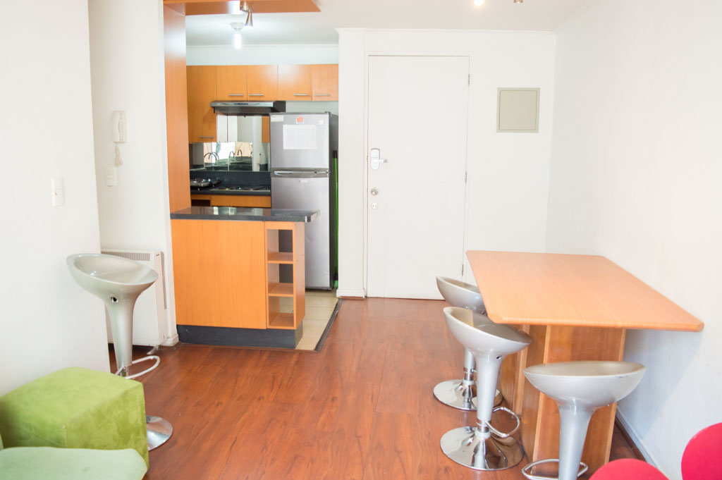 Departamento amoblado de 2 habitaciones ubicado a 2 minutos caminando de la parada de autobús y a 2 minutos caminando de la Estación de Metro Universidad de Chile.El departamento tiene living, comedor, cocina (abierta) y 2 baños. La habitación 1 tiene cama matrimonial, 2 mesas de noche, televisor y baño en suite; La habitación 2 tiene litera, clóset y mesa de noche; El lugar mide 45m² aproximadamente. Los gastos de servicios de gastos comunes, agua caliente, agua fría, electricidad, internet y TV cable se pagan por adelantado junto a la renta mensual, con un límite de consumo de $ 220USD. El alojamiento tiene lavandería compartida cuyo valor es $ 1USD aproximadamente por carga de ropa (lavado o secado). Se debe pagar garantía (depósito) la que será devuelta al finalizar el período de arriendo; además, se debe pagar $ 46USD al momento de devolver el alojamiento para realizar la limpieza del lugar. Cerca del alojamiento se encuentra la Avenida Bernardo O'Higgins (más conocida como Alameda) donde hay diversos locales comerciales, gran variedad de transporte público y el centro cívico de Santiago. A pasos del metro se encuentra el emblemático Instituto Nacional José Miguel Carrera, la Universidad de Chile y el Teatro Municipal de Santiago.