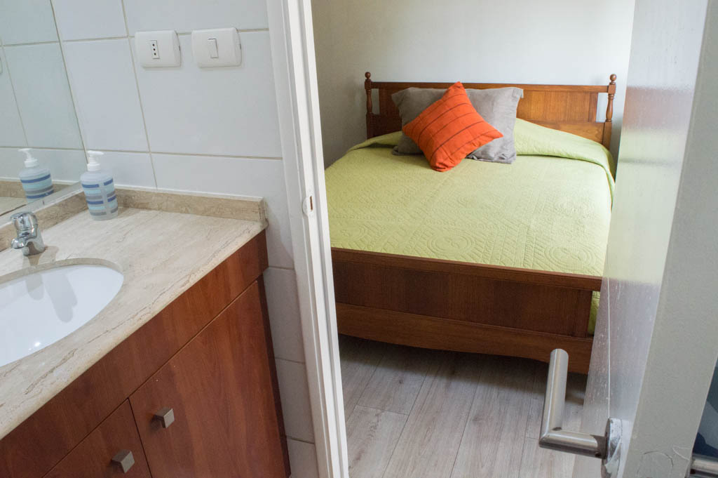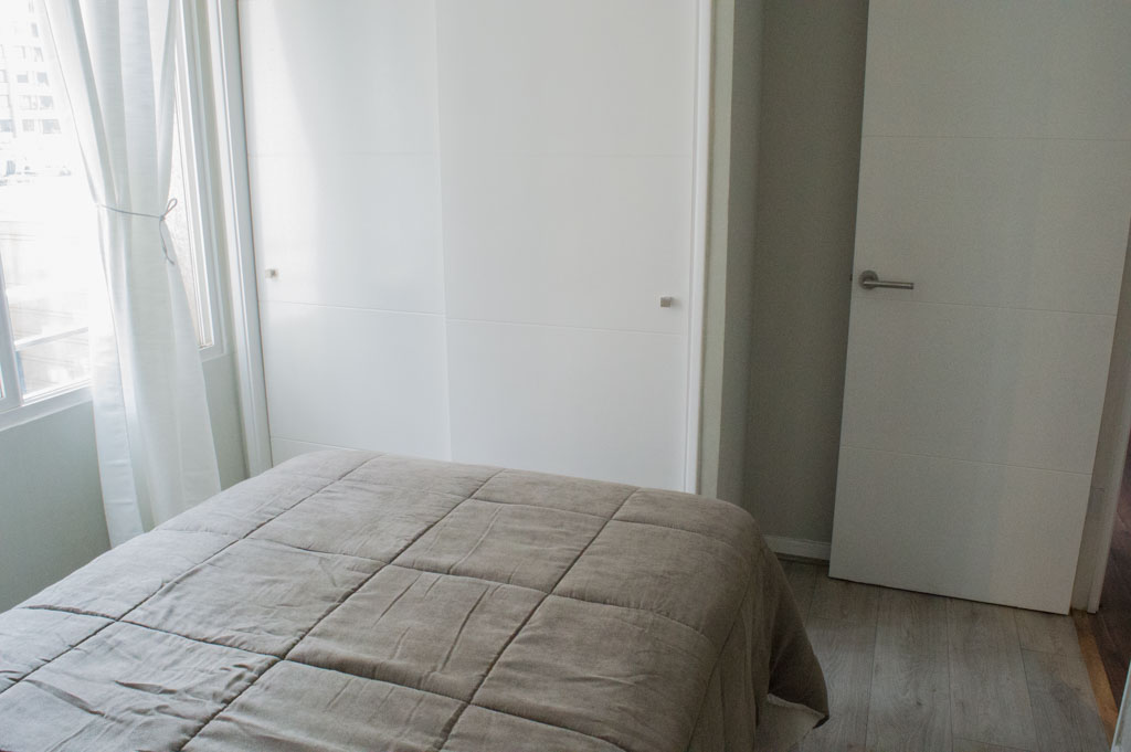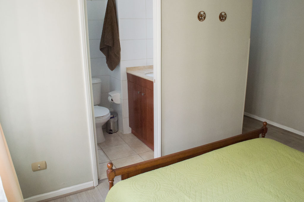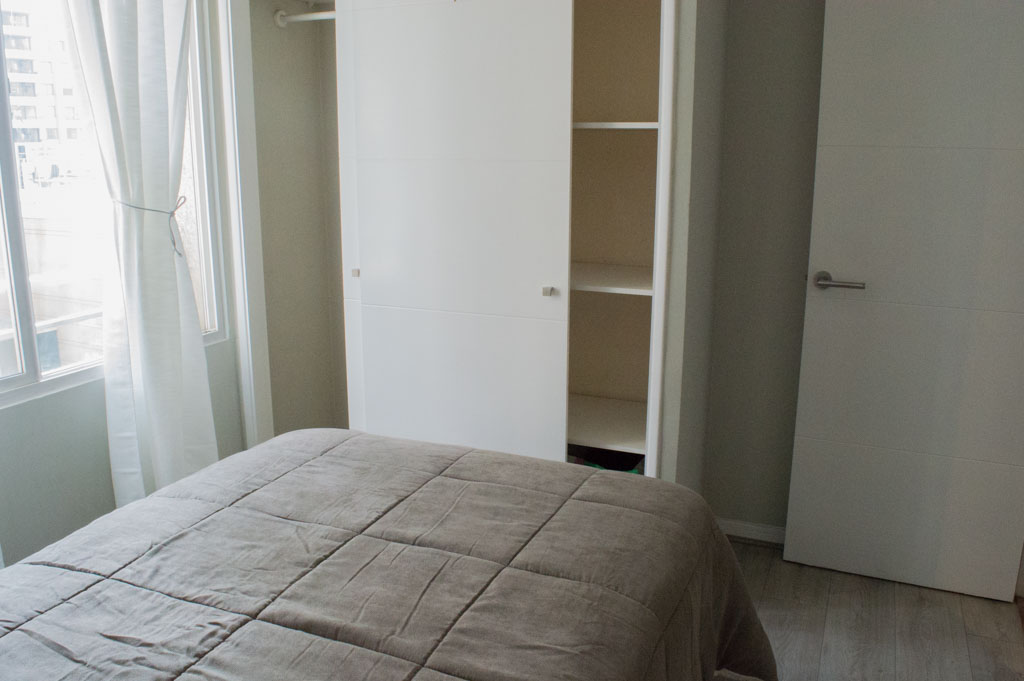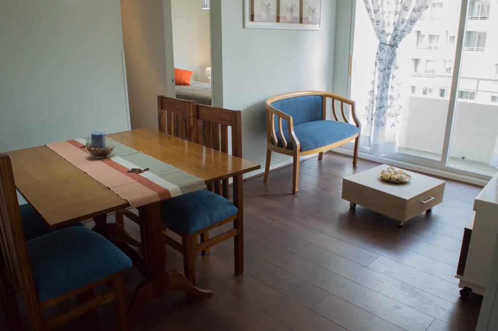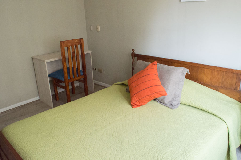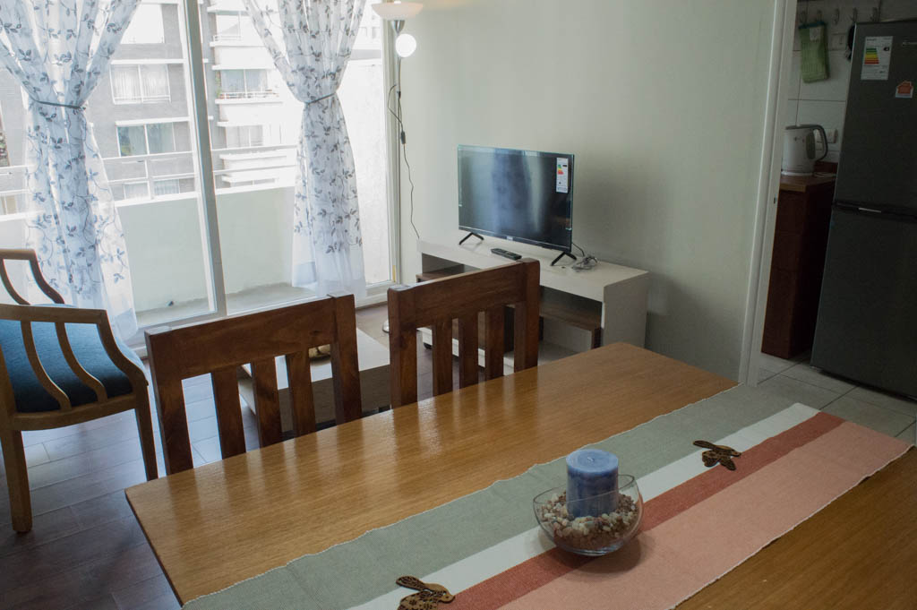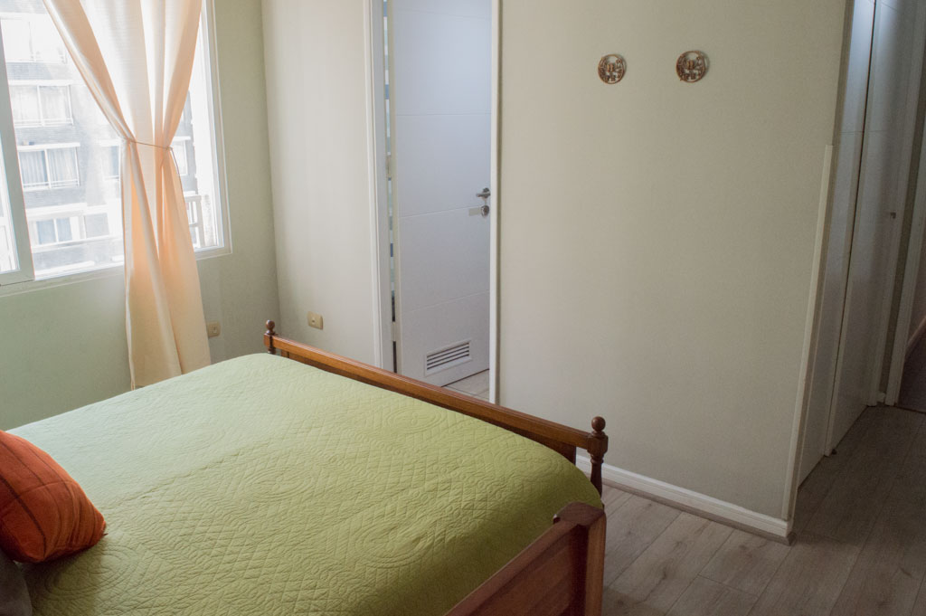 Departamento amoblado de 2 habitaciones ubicado a 1 minuto caminando de la parada de autobús y a 5 minutos caminando de la Estación de Metro Santa Ana.El departamento tiene living, comedor, cocina (cerrada), 2 baños, balcón y 1 estacionamiento (opcional por un valor de $ 99USD adicional). La habitación 1 tiene cama matrimonial, clóset, mesa de noche, escritorio, silla y baño en suite; La habitación 2 tiene cama individual, clóset y mesa de noche; El lugar mide 50m² + 3m² de terraza aproximadamente. Los gastos de servicios de gastos comunes, agua caliente, agua fría, electricidad y gas se pagan por adelantado junto a la renta mensual, con un límite de consumo de $ 269USD. El alojamiento tiene lavandería compartida cuyo valor es $ 1USD aproximadamente por carga de ropa (lavado o secado). Se debe pagar garantía (depósito) la que será devuelta al finalizar el período de arriendo; además, se debe pagar $ 77USD al momento de devolver el alojamiento para realizar la limpieza del lugar. Cerca del alojamiento se encuentra los emblemáticos liceo 1 Javiera Carrera y Liceo Aplicación, además de la iglesia Parroquial de Santa Ana, monumento nacional. A pasos podrás encontrar la plaza de Armas de Santiago, parte importante del casco histórico de Santiago, reconocido por su arquitectura e infraestructuras, tales como el Correo de Santiago, Catedral de Santiago, Municipalidad y la Casa Colorada.