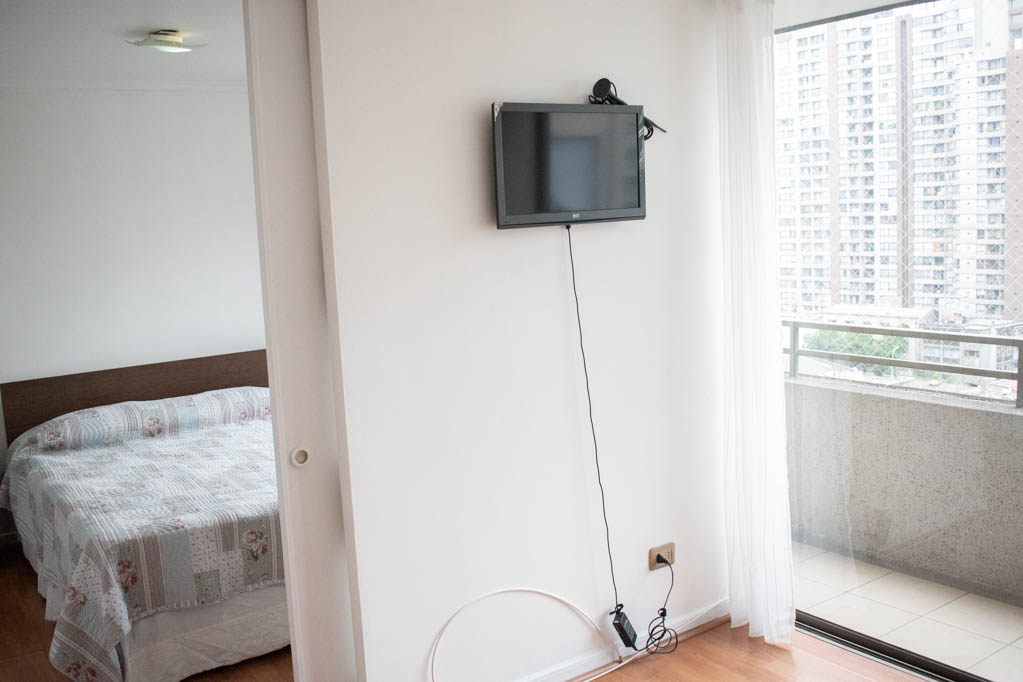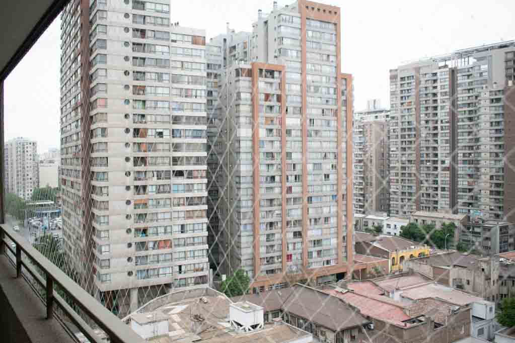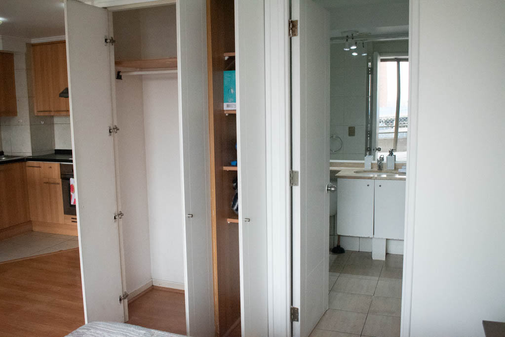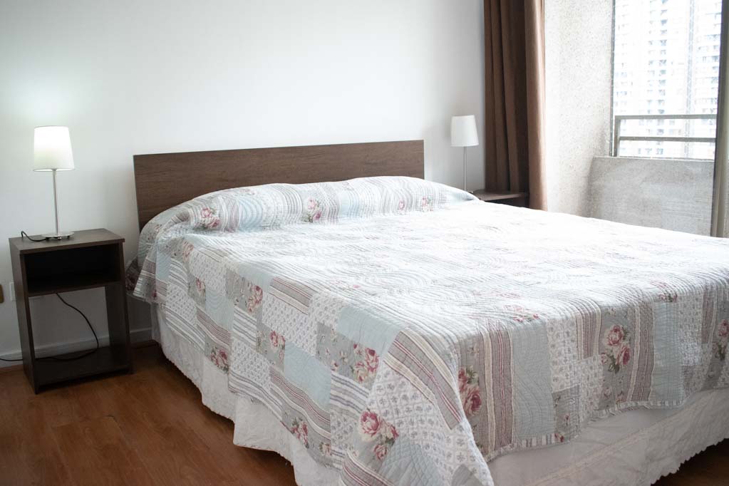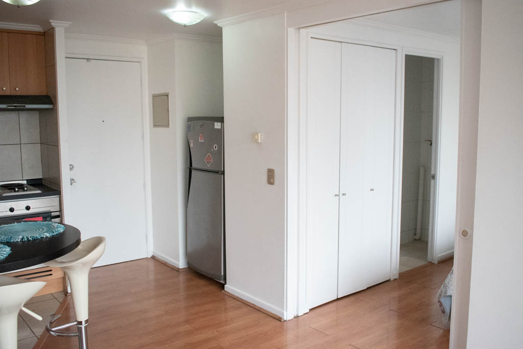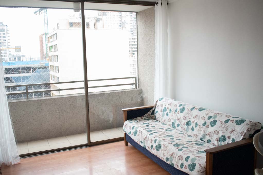 Departamento amoblado de 1 habitación ubicado a 1 minuto caminando de la parada de autobús y a 6 minutos caminando de la Estación de Metro Santa Lucía.El departamento tiene living, comedor, cocina (abierta), 1 baño y balcón. La habitación 1 tiene cama matrimonial, clóset, 2 mesas de noche y baño en suite; El lugar mide 33m² + 2m² de terraza aproximadamente. Los gastos de servicios de gastos comunes, agua caliente, agua fría y electricidad se pagan por adelantado junto a la renta mensual, con un límite de consumo de $ 121USD. El alojamiento tiene lavandería compartida cuyo valor es $ 2USD aproximadamente por carga de ropa (lavado o secado). Se debe pagar garantía (depósito) la que será devuelta al finalizar el período de arriendo; además, se debe pagar $ 55USD al momento de devolver el alojamiento para realizar la limpieza del lugar. Cerca del alojamiento se encuentra la Biblioteca Nacional, Teatro Municipal de Santiago, Cine Arte, ferias artesanales, centros culturales y el Cerro Santa Lucía, importante foco de turismo y paseos dominicales por los atractivos que presenta, como fuentes de agua, terrazas y miradores donde puedes disfrutar de una vista privilegiada de Santiago.