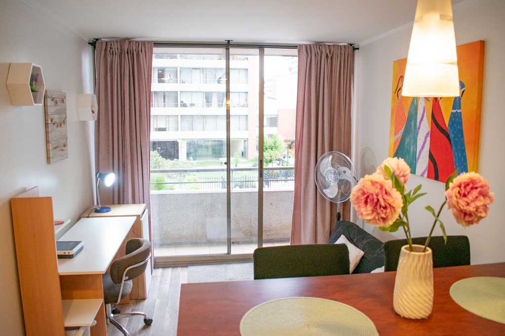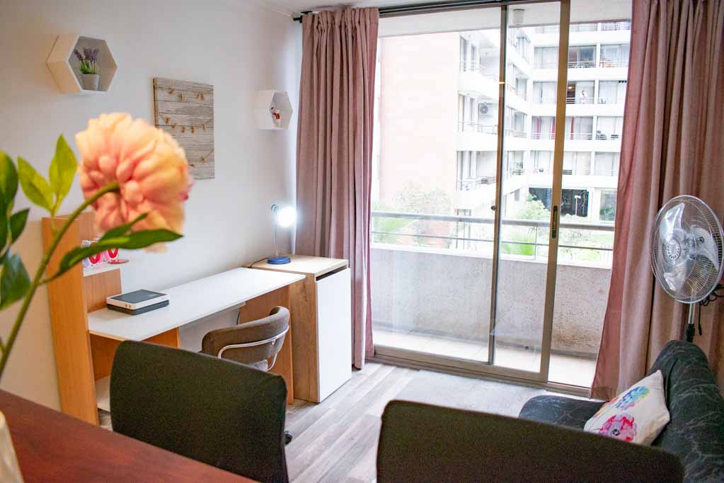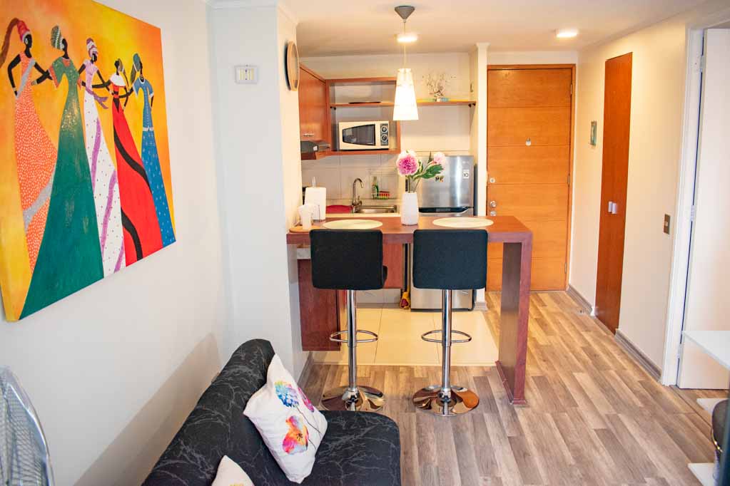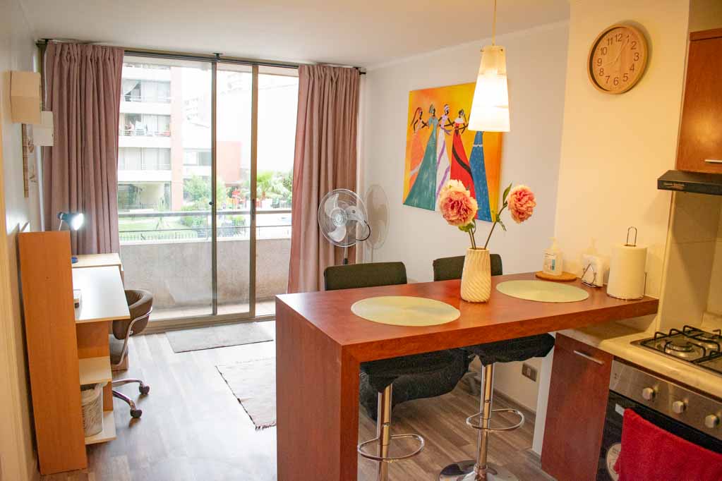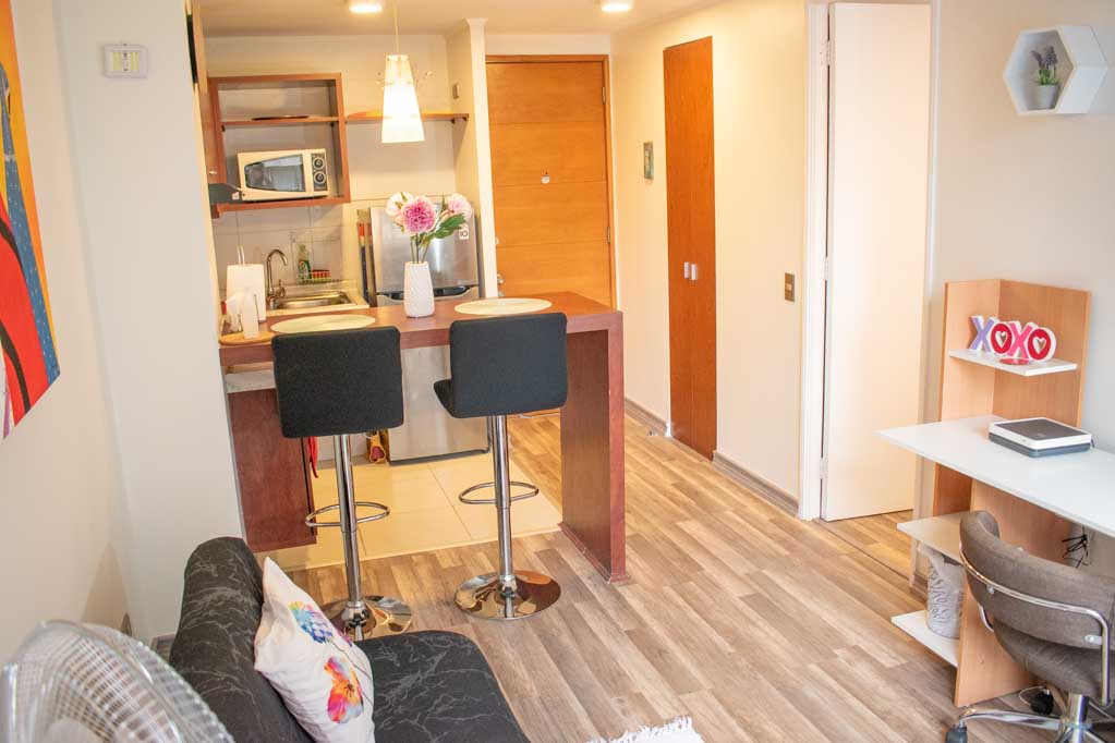 Departamento de 1 habitación, con orientación oriente (este), ubicado a 3 minutos caminando de la parada de autobús y a 5 minutos caminando de la Estación de Metro Santa Lucía.Características generales:
