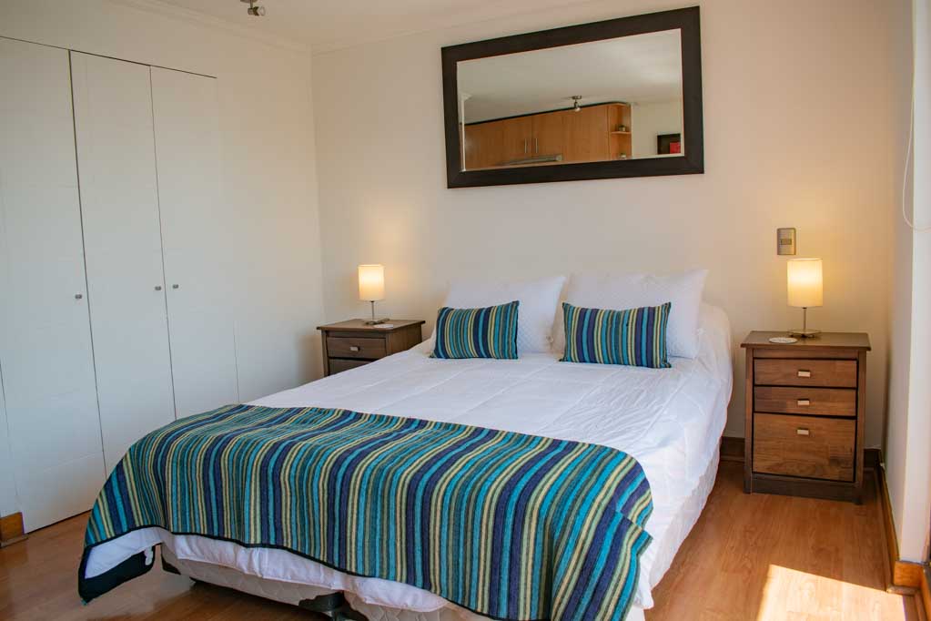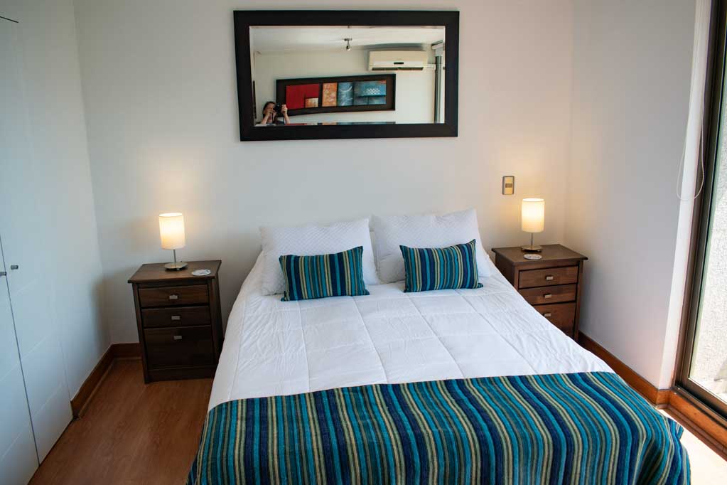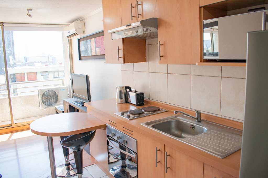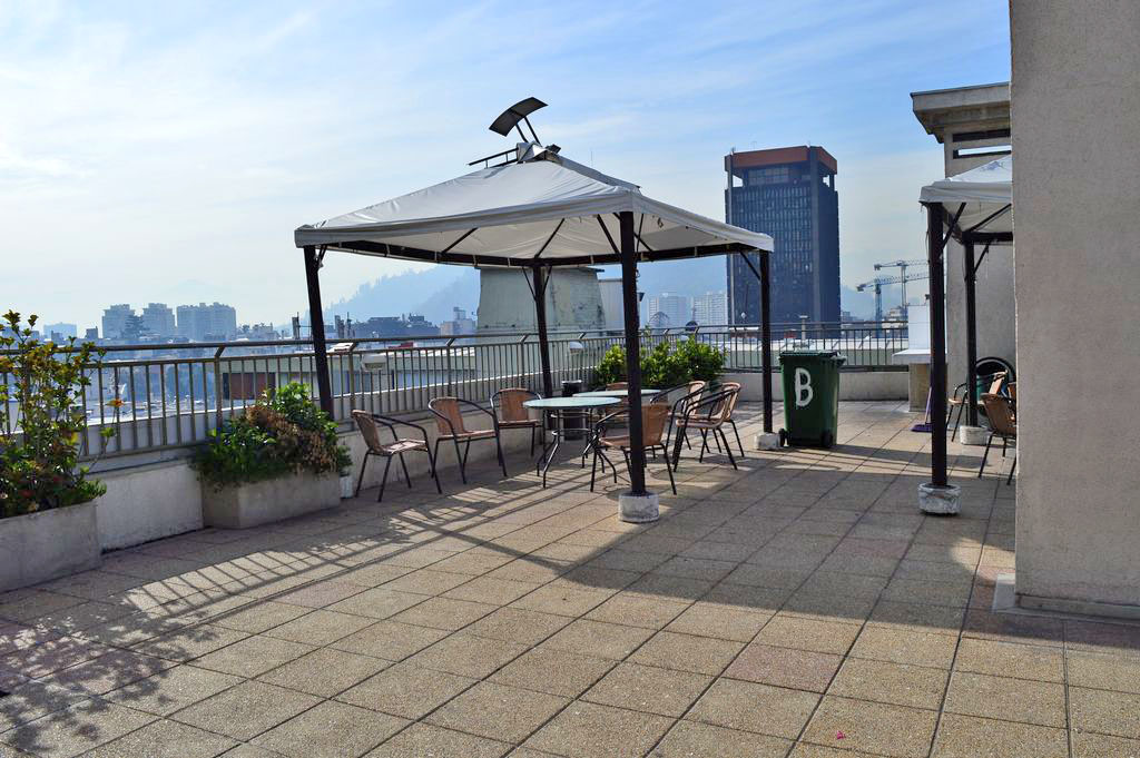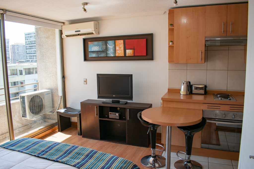 Departamento amoblado de un ambiente (studio) ubicado a 5 minutos caminando de la parada de autobús y a 3 minutos caminando de la Estación de Metro Universidad Católica.El departamento tiene comedor, cocina (abierta), 1 baño y balcón. La habitación 1 tiene cama matrimonial, clóset, 2 mesas de noche, televisor y baño en suite; El lugar mide 32m² + 1m² de terraza aproximadamente. Se debe considerar el pago de gastos de servicios de gastos comunes, agua caliente, agua fría y electricidad que suman $ 98USD aproximadamente. El alojamiento tiene lavandería compartida cuyo valor es $ 2USD aproximadamente por carga de ropa (lavado o secado). Se debe pagar garantía (depósito) la que será devuelta al finalizar el período de arriendo; además, se debe pagar $ 44USD al momento de devolver el alojamiento para realizar la limpieza del lugar. Cerca del alojamiento se encuentra la Facultad de Arquitectura de la Universidad de Chile y la Casa Central de la Universidad Católica. En la Avenida Bernardo O'Higgins (más conocida como Alameda) es posible encontrar gran variedad de locales comerciales, bancos, cines, restaurantes y medios de transporte público. En sus proximidades, también podrás disfrutar del Barrio Lastarria conocido por sus diversos bares, cafés, restaurantes y centros culturales como el GAM.