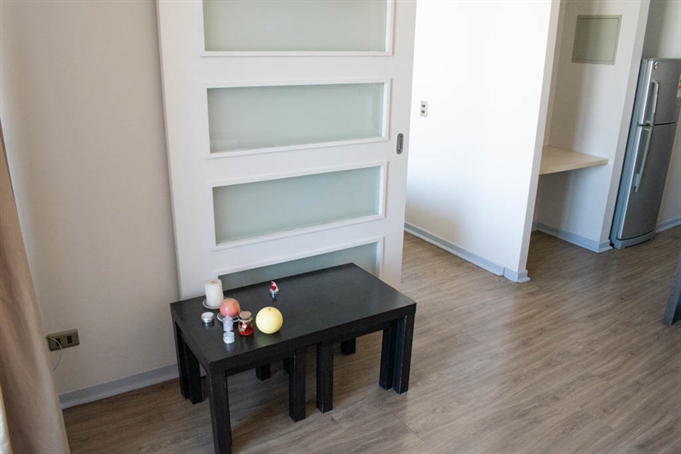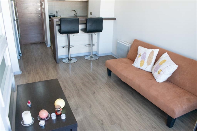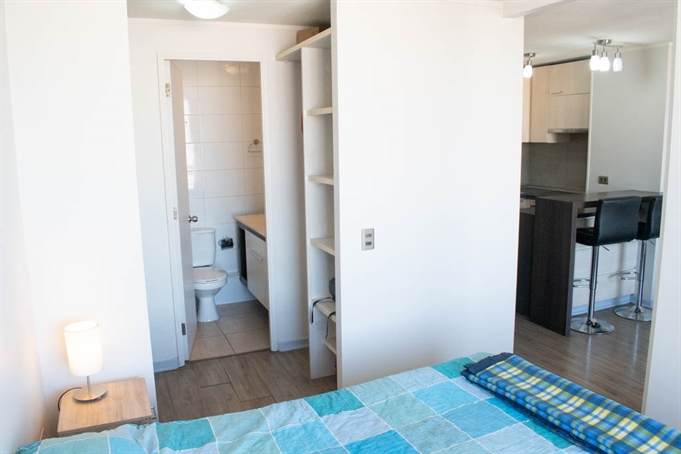 Departamento amoblado de 1 habitación ubicado a 3 minutos caminando de la parada de autobús y a 6 minutos caminando de la Estación de Metro Santa Lucía.El departamento tiene living, comedor, cocina (abierta), 1 baño y balcón. La habitación 1 tiene cama matrimonial, clóset, 2 mesas de noche, televisor y baño en suite; El lugar mide 33m² + 2m² de terraza aproximadamente. Se debe considerar el pago de gastos de servicios de gastos comunes, agua caliente, agua fría y electricidad que suman $ 136USD aproximadamente. El alojamiento tiene lavandería compartida cuyo valor es $ 2USD aproximadamente por carga de ropa (lavado o secado). Se debe pagar garantía (depósito) la que será devuelta al finalizar el período de arriendo; además, se debe pagar $ 52USD al momento de devolver el alojamiento para realizar la limpieza del lugar. Cerca del alojamiento se encuentra la Biblioteca Nacional, Teatro Municipal de Santiago, Cine Arte, ferias artesanales, centros culturales y el Cerro Santa Lucía, importante foco de turismo y paseos dominicales por los atractivos que presenta, como fuentes de agua, terrazas y miradores donde puedes disfrutar de una vista privilegiada de Santiago.