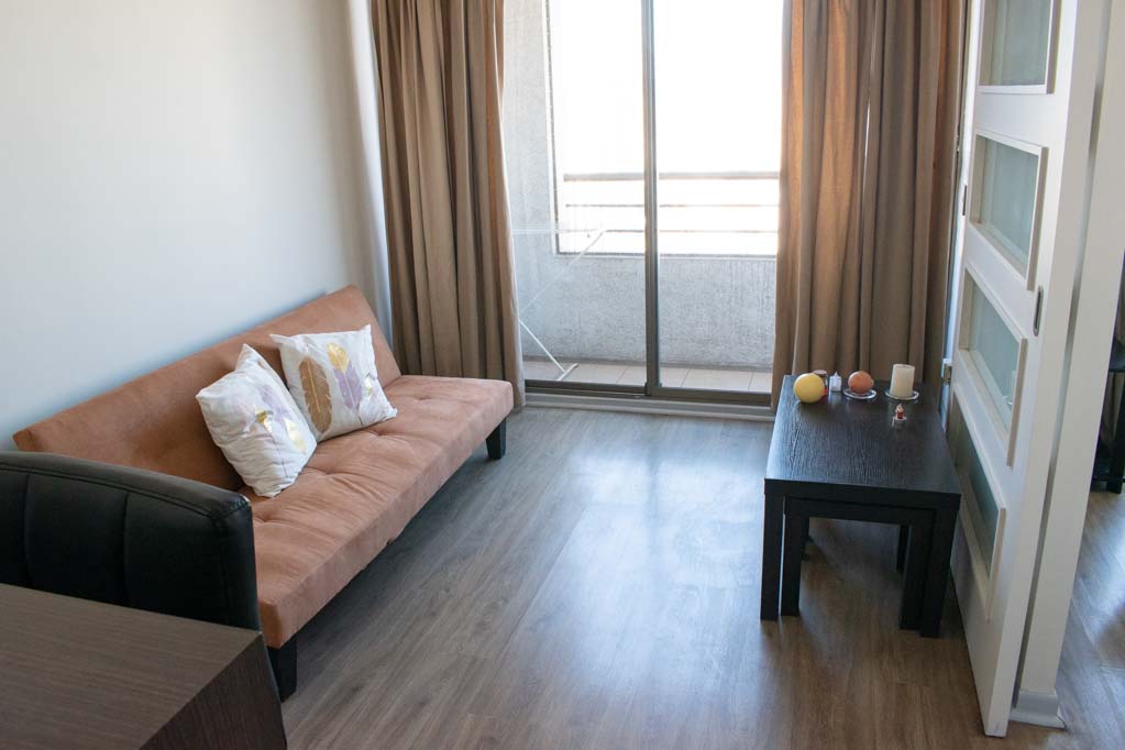 Departamento amoblado de 1 habitación ubicado a 3 minutos caminando de la parada de autobús y a 6 minutos caminando de la Estación de Metro Santa Lucía.El departamento tiene living, comedor, cocina (abierta), 1 baño y balcón. La habitación 1 tiene cama matrimonial, clóset, 2 mesas de noche, televisor y baño en suite; El lugar mide 33m² + 2m² de terraza aproximadamente. Los gastos de servicios de gastos comunes, agua caliente, agua fría y electricidad se pagan por adelantado junto a la renta mensual, con un límite de consumo de $ 119USD. El alojamiento tiene lavandería compartida cuyo valor es $ 2USD aproximadamente por carga de ropa (lavado o secado). Se debe pagar garantía (depósito) la que será devuelta al finalizar el período de arriendo; además, se debe pagar $ 54USD al momento de devolver el alojamiento para realizar la limpieza del lugar. Cerca del alojamiento se encuentra la Biblioteca Nacional, Teatro Municipal de Santiago, Cine Arte, ferias artesanales, centros culturales y el Cerro Santa Lucía, importante foco de turismo y paseos dominicales por los atractivos que presenta, como fuentes de agua, terrazas y miradores donde puedes disfrutar de una vista privilegiada de Santiago.
