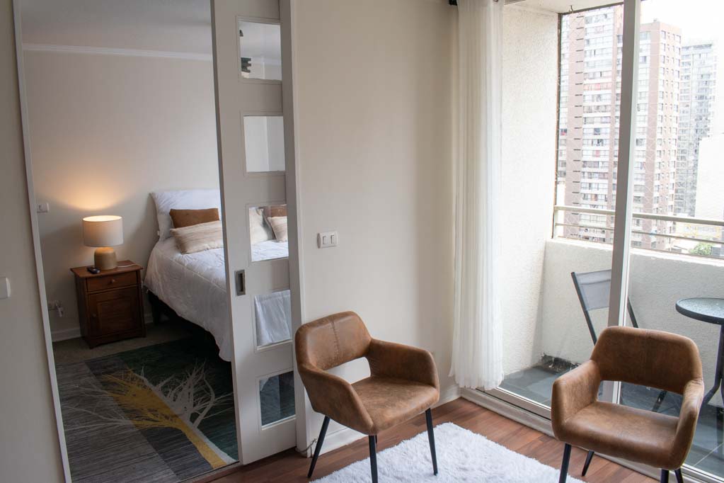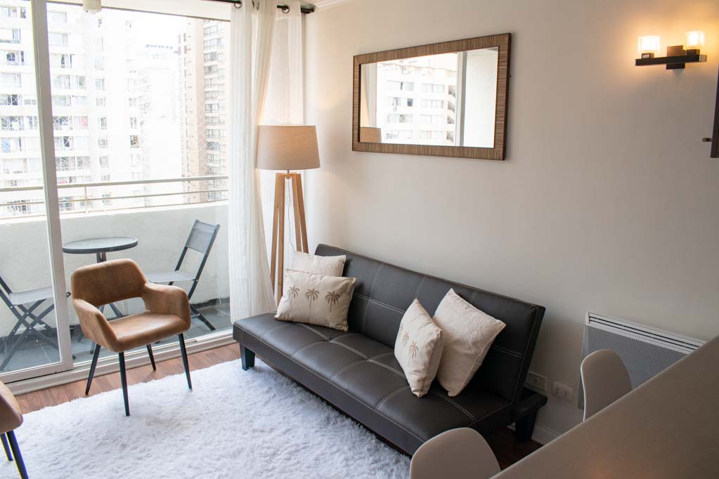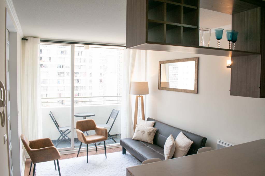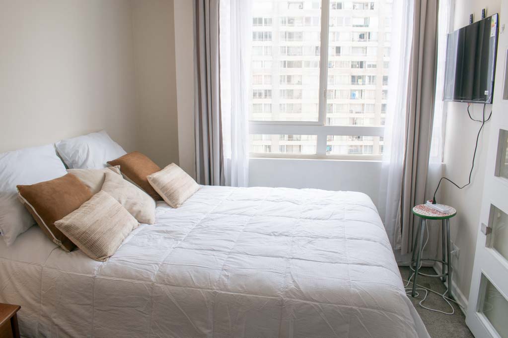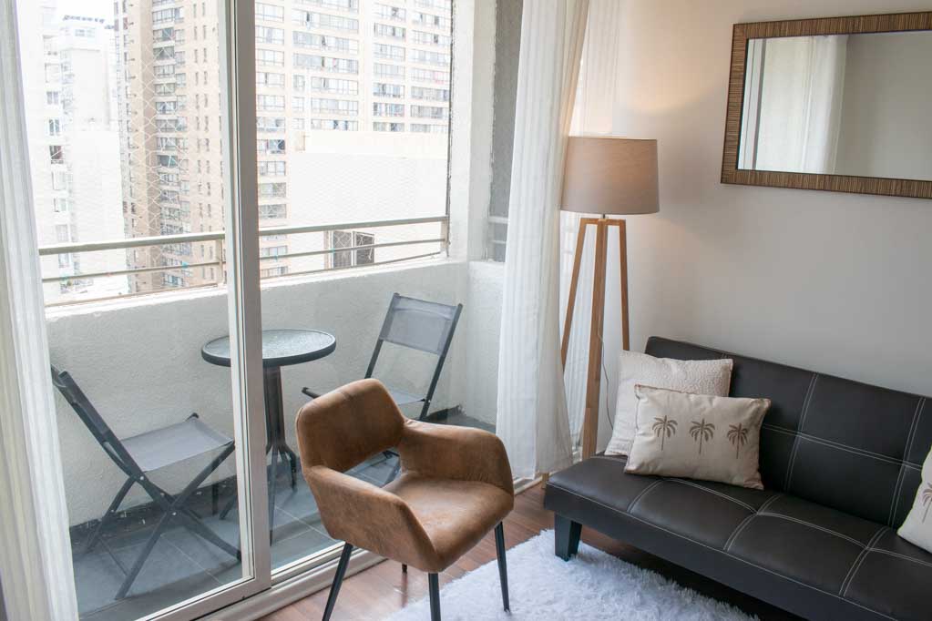 Departamento amoblado de 1 habitación ubicado a 1 minuto caminando de la parada de autobús y a 10 minutos caminando de la Estación de Metro Universidad de Chile.El departamento tiene living, cocina (abierta), 1 baño y balcón. La habitación 1 tiene cama matrimonial, clóset, mesa de noche, televisor y baño en suite; El lugar mide 28m² + 2m² de terraza aproximadamente. Se debe considerar el pago de gastos de servicios de gastos comunes, agua caliente, agua fría y electricidad que suman $ 106USD aproximadamente. El alojamiento tiene lavandería compartida cuyo valor es $ 2USD aproximadamente por carga de ropa (lavado o secado). Se debe pagar garantía (depósito) la que será devuelta al finalizar el período de arriendo. Cerca del alojamiento se encuentra la Avenida Bernardo O'Higgins (más conocida como Alameda) donde hay diversos locales comerciales, gran variedad de transporte público y el centro cívico de Santiago. A pasos del metro se encuentra el emblemático Instituto Nacional José Miguel Carrera, la Universidad de Chile y el Teatro Municipal de Santiago.