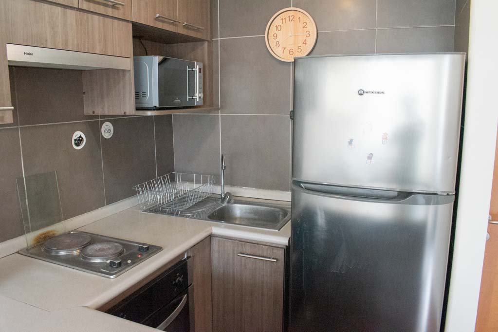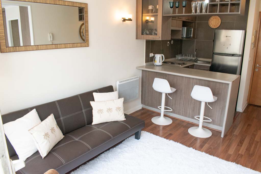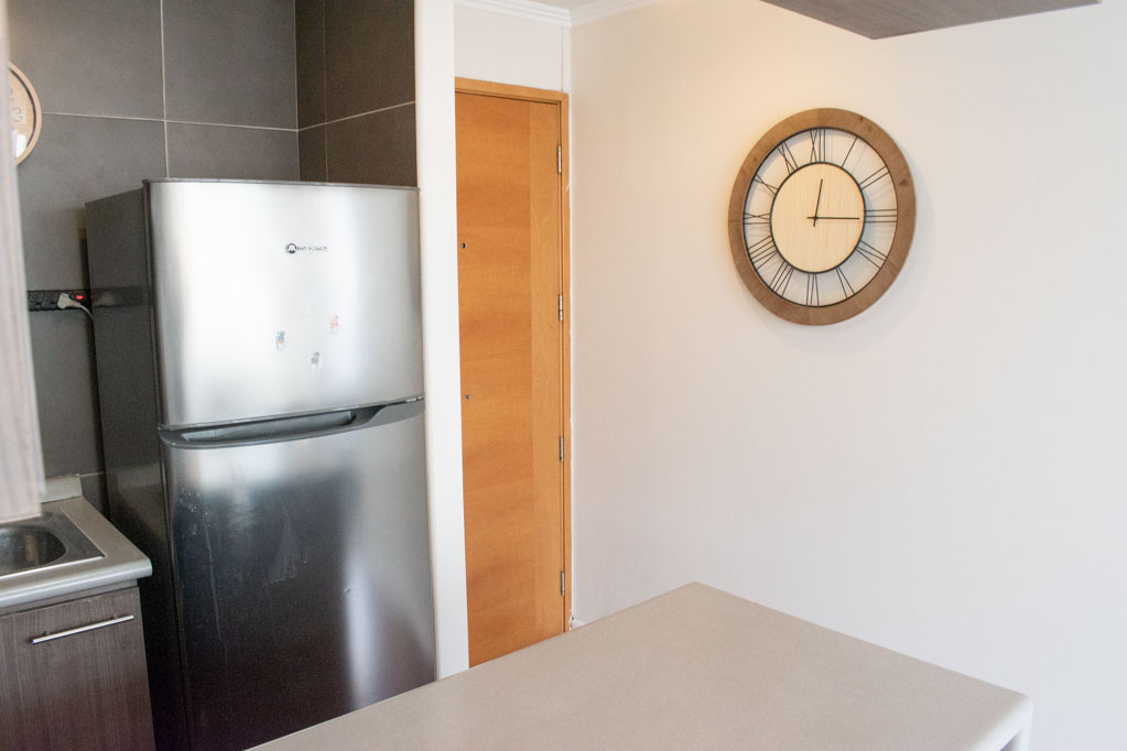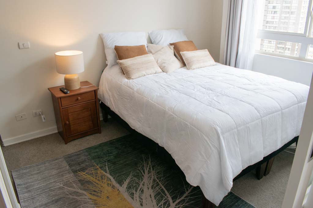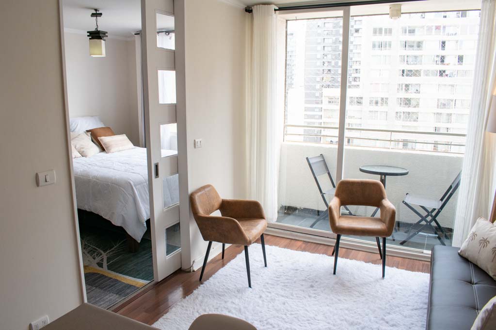 Departamento amoblado de 1 habitación ubicado a 1 minuto caminando de la parada de autobús y a 10 minutos caminando de la Estación de Metro Universidad de Chile.El departamento tiene living, cocina (abierta), 1 baño y balcón. La habitación 1 tiene cama matrimonial, clóset, mesa de noche, televisor y baño en suite; El lugar mide 28m² + 2m² de terraza aproximadamente. Se debe considerar el pago de gastos de servicios de gastos comunes, agua caliente, agua fría y electricidad que suman $ 106USD aproximadamente. El alojamiento tiene lavandería compartida cuyo valor es $ 2USD aproximadamente por carga de ropa (lavado o secado). Se debe pagar garantía (depósito) la que será devuelta al finalizar el período de arriendo. Cerca del alojamiento se encuentra la Avenida Bernardo O'Higgins (más conocida como Alameda) donde hay diversos locales comerciales, gran variedad de transporte público y el centro cívico de Santiago. A pasos del metro se encuentra el emblemático Instituto Nacional José Miguel Carrera, la Universidad de Chile y el Teatro Municipal de Santiago.