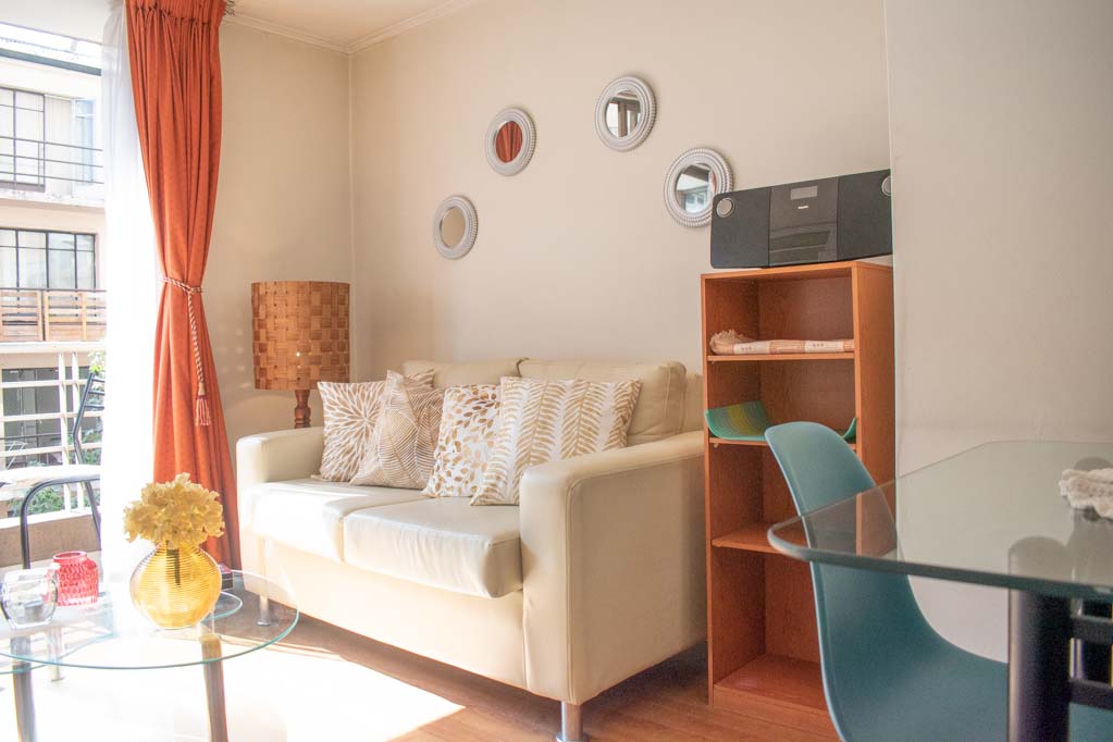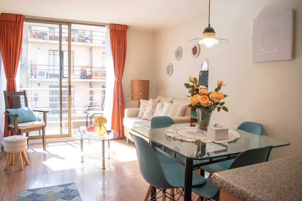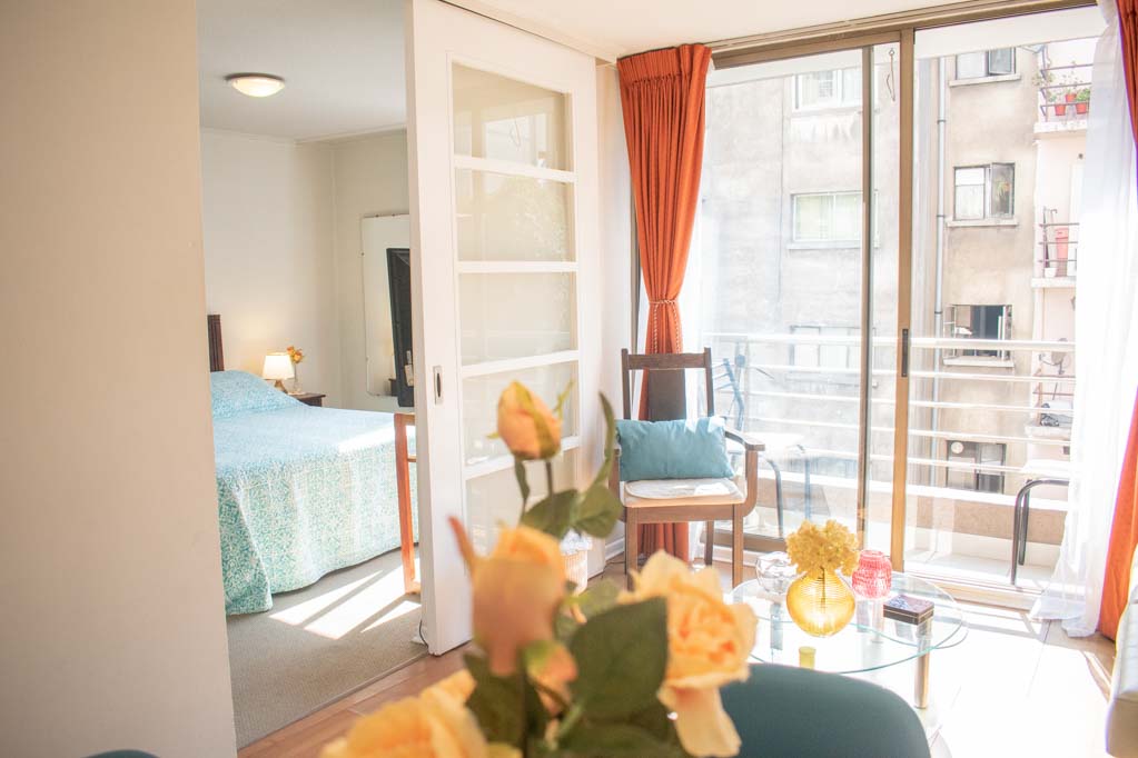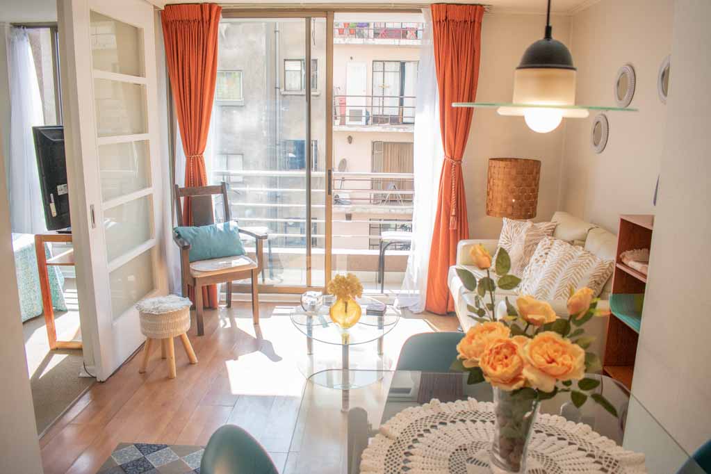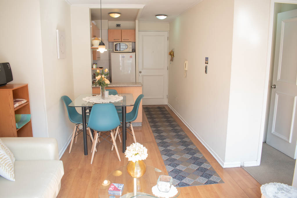 Departamento amoblado de 1 habitación ubicado a 3 minutos caminando de la parada de autobús y a 1 minuto caminando de la Estación de Metro Bellas Artes.El departamento tiene living, comedor, cocina (abierta), 1 baño y balcón. La habitación 1 tiene cama matrimonial, walk-in clóset, 2 mesas de noche, televisor y baño en suite; El lugar mide 38m² + 2m² de terraza aproximadamente. Los gastos de servicios de gastos comunes, agua caliente, agua fría, electricidad, gas, internet y TV cable se pagan por adelantado junto a la renta mensual, con un límite de consumo de $ 203USD. El alojamiento tiene lavandería compartida cuyo valor es $ 2USD aproximadamente por carga de ropa (lavado o secado). Se debe pagar garantía (depósito) la que será devuelta al finalizar el período de arriendo; además, se debe pagar $ 27USD al momento de devolver el alojamiento para realizar la limpieza del lugar. Cerca del alojamiento se encuentra el Barrio Lastarria y Barrio Bellas Artes (barrios históricos - culturales), caracterizados por sus casonas del siglo XIX restauradas y utilizadas como restaurantes, cafeterías, librerías, centros culturales, entre otros. A pasos podrás encontrar el Museo Nacional de Bellas Artes, donde se resguarda lo más valioso del arte nacional e internacional y el Parque Forestal, lugar ideal para compartir con amigos, practicar deportes y pasear.