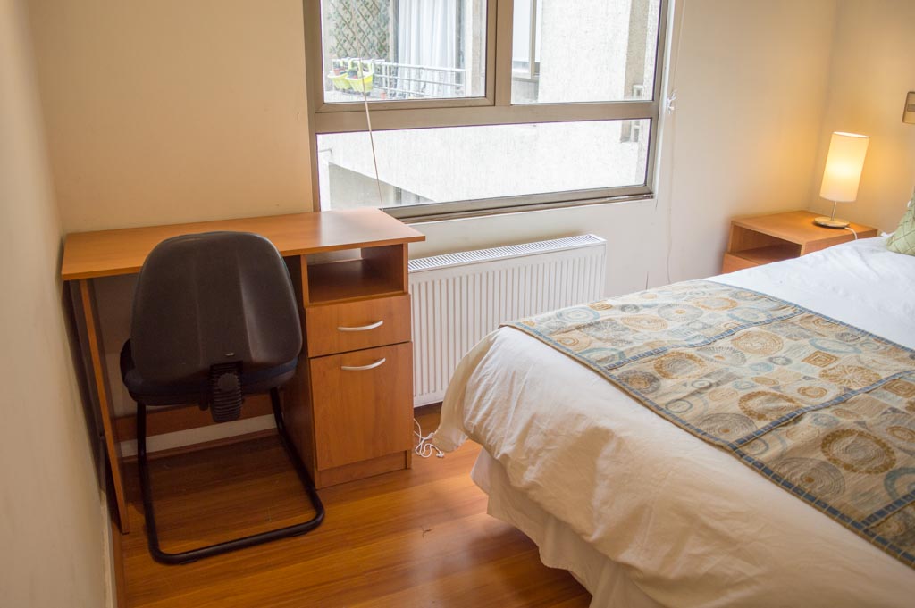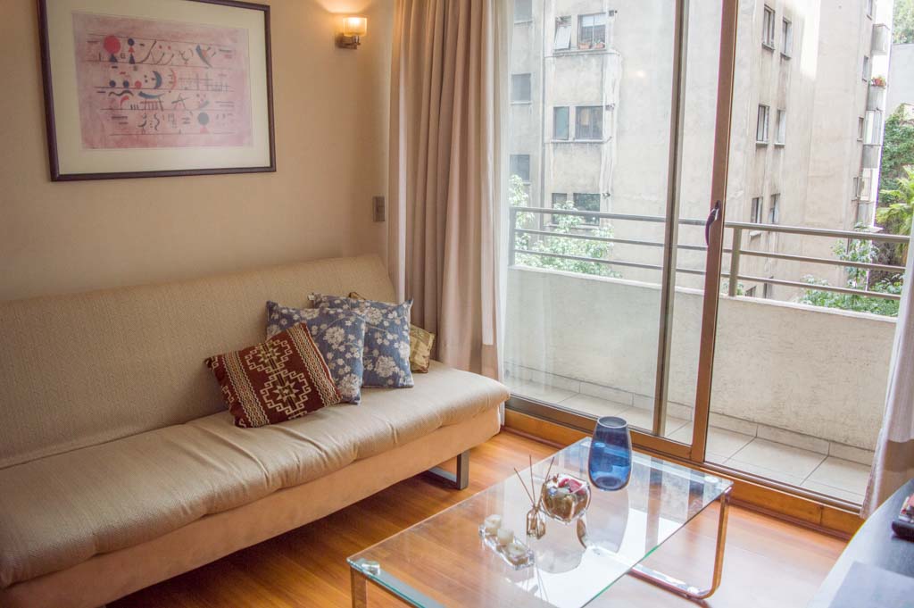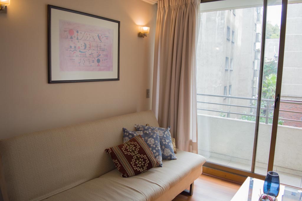 Departamento amoblado de 1 habitación ubicado a 2 minutos caminando de la parada de autobús y a 2 minutos caminando de la Estación de Metro Universidad Católica.El departamento tiene living, comedor, cocina (abierta), 1 baño y balcón. La habitación 1 tiene cama matrimonial, 2 mesas de noche y baño en suite; El lugar mide 33m² aproximadamente. Los gastos de servicios de gastos comunes, agua caliente, agua fría, electricidad e internet se pagan por adelantado junto a la renta mensual, con un límite de consumo de $ 151USD. El alojamiento tiene lavandería compartida cuyo valor es $ 1USD aproximadamente por carga de ropa (lavado o secado). Se debe pagar garantía (depósito) la que será devuelta al finalizar el período de arriendo; además, se debe pagar $ 29USD al momento de devolver el alojamiento para realizar la limpieza del lugar. Cerca del alojamiento se encuentra la Facultad de Arquitectura de la Universidad de Chile y la Casa Central de la Universidad Católica. En la Avenida Bernardo O'Higgins (más conocida como Alameda) es posible encontrar gran variedad de locales comerciales, bancos, cines, restaurantes y medios de transporte público. En sus proximidades, también podrás disfrutar del Barrio Lastarria conocido por sus diversos bares, cafés, restaurantes y centros culturales como el GAM.