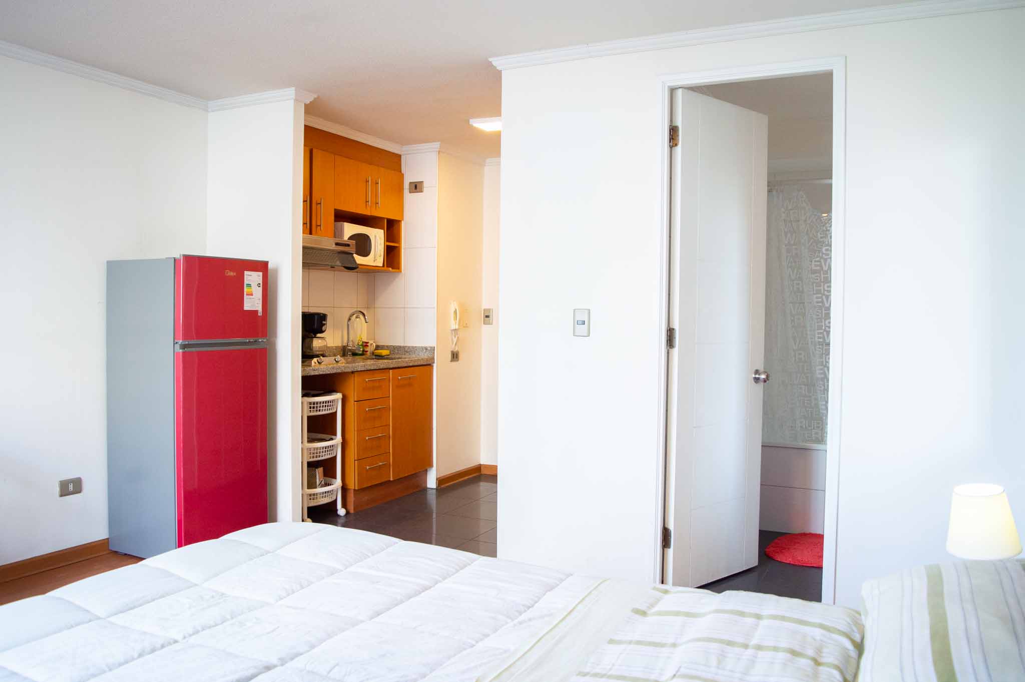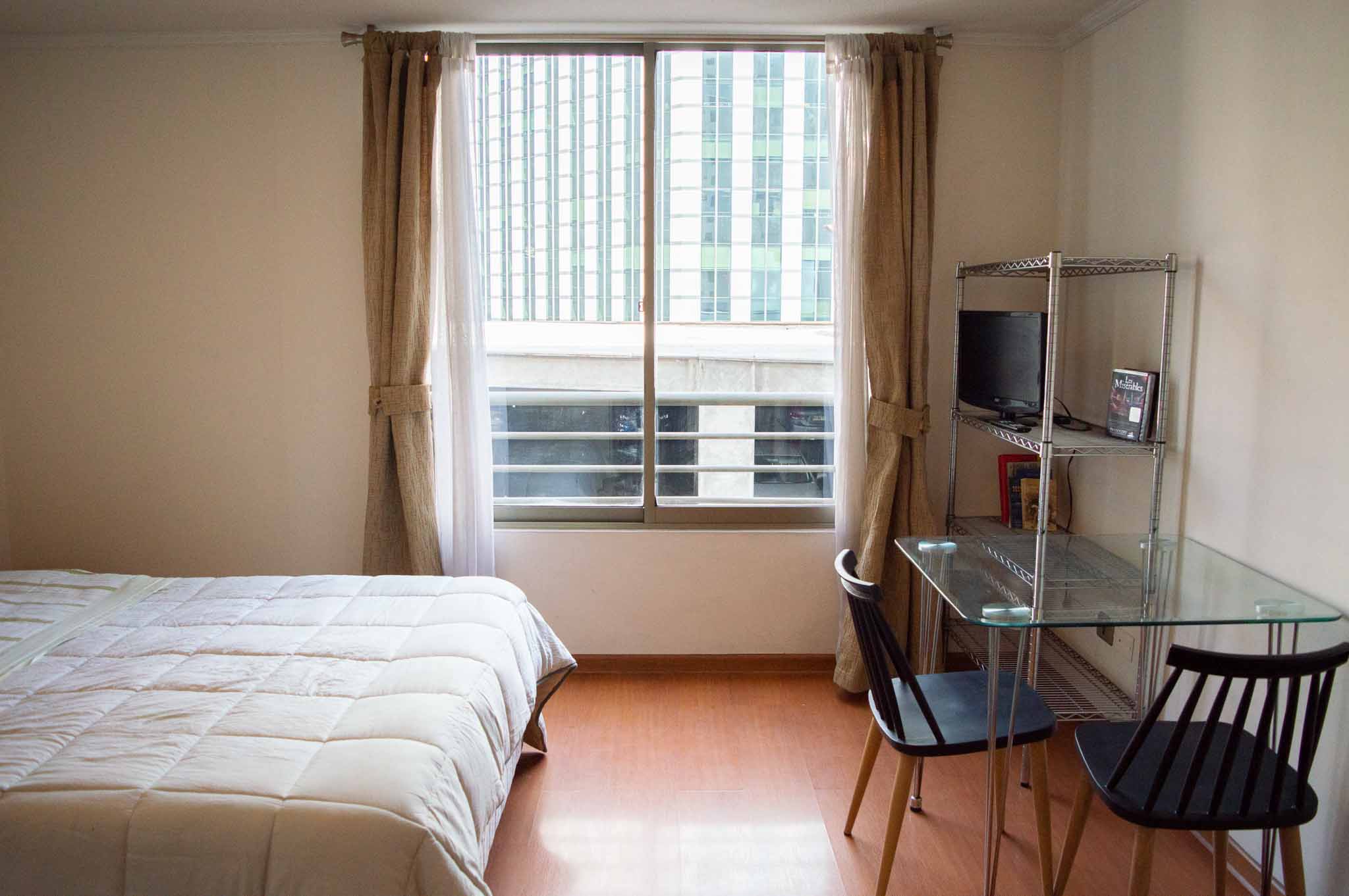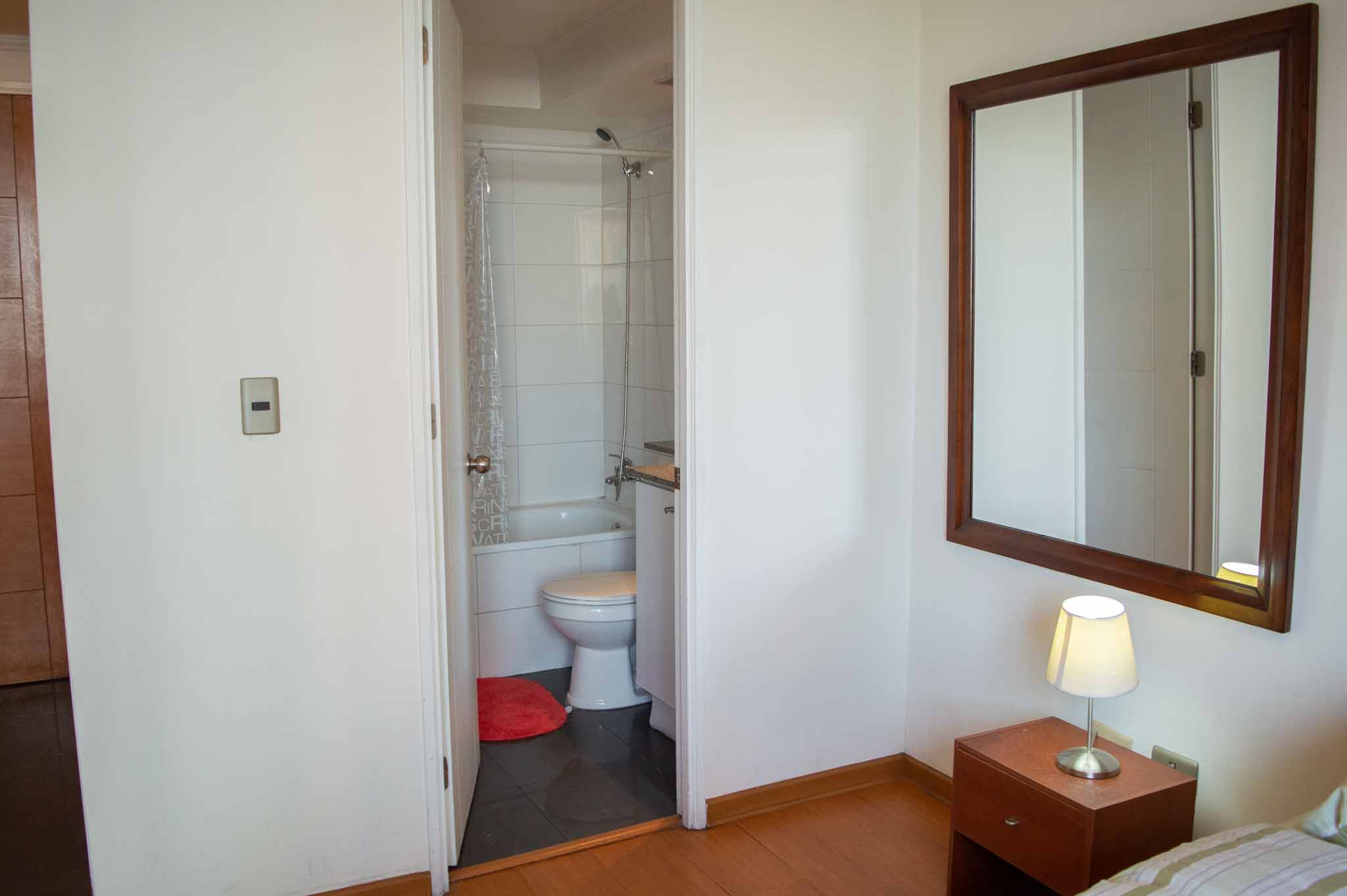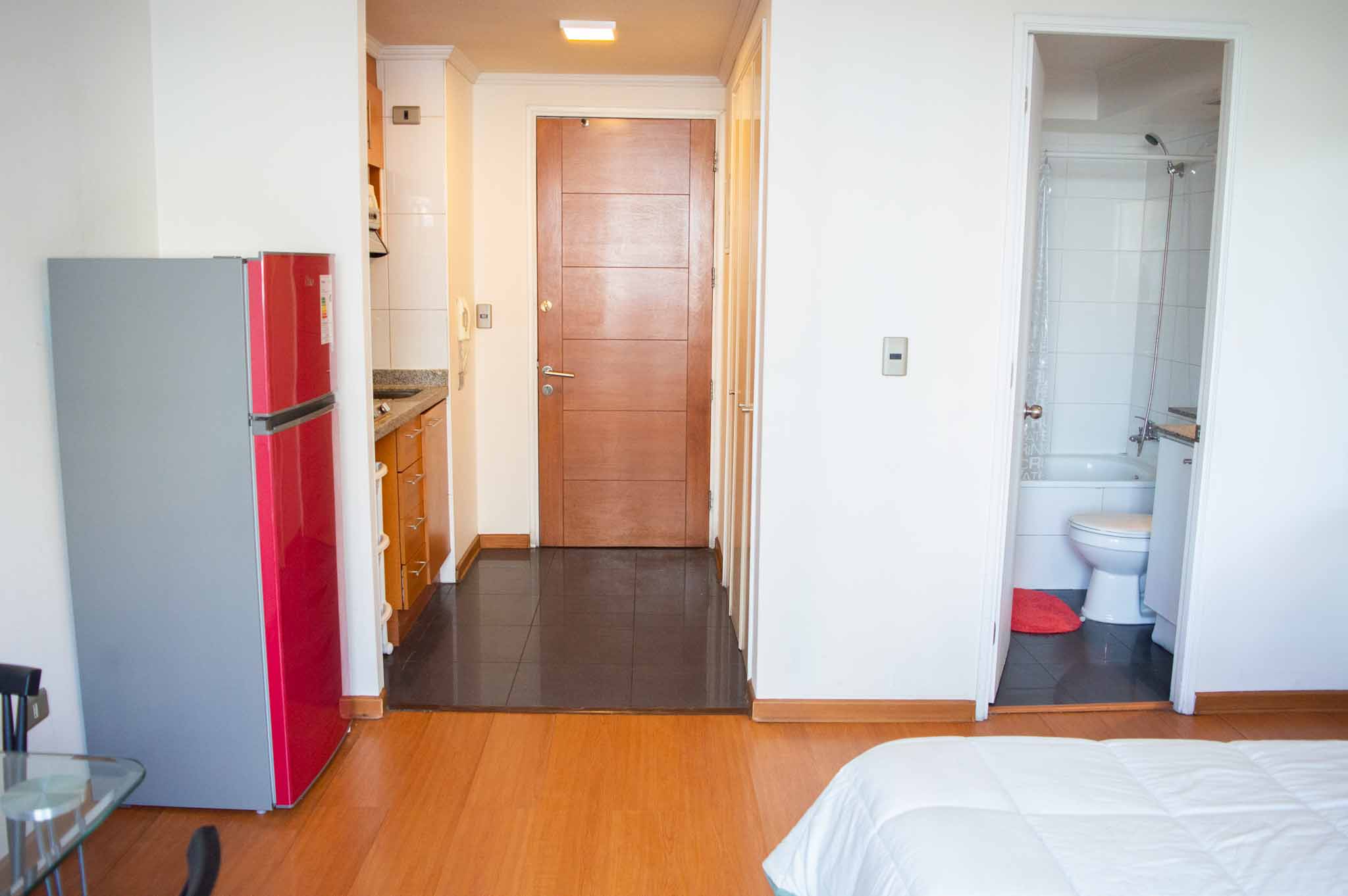 Departamento amoblado de un ambiente (studio) ubicado a 2 minutos caminando de la parada de autobús y a 4 minutos caminando de la Estación de Metro Bellas Artes.El departamento tiene living, comedor, cocina (kitchinette) y 1 baño. La habitación 1 tiene cama matrimonial, clóset, 2 mesas de noche, televisor, silla y baño en suite; El lugar mide 25m² aproximadamente. Los gastos de servicios de internet se pagan por adelantado junto a la renta mensual, con un límite de consumo de $ 22USD. Además, se debe considerar el pago de gastos de servicios de gastos comunes, agua caliente, agua fría y electricidad que suman $ 114USD aproximadamente. El alojamiento tiene lavandería compartida cuyo valor es $ 2USD aproximadamente por carga de ropa (lavado o secado). Se debe pagar garantía (depósito) la que será devuelta al finalizar el período de arriendo; además, se debe pagar $ 43USD al momento de devolver el alojamiento para realizar la limpieza del lugar. Cerca del alojamiento se encuentra el Barrio Lastarria y Barrio Bellas Artes (barrios históricos - culturales), caracterizados por sus casonas del siglo XIX restauradas y utilizadas como restaurantes, cafeterías, librerías, centros culturales, entre otros. A pasos podrás encontrar el Museo Nacional de Bellas Artes, donde se resguarda lo más valioso del arte nacional e internacional y el Parque Forestal, lugar ideal para compartir con amigos, practicar deportes y pasear.