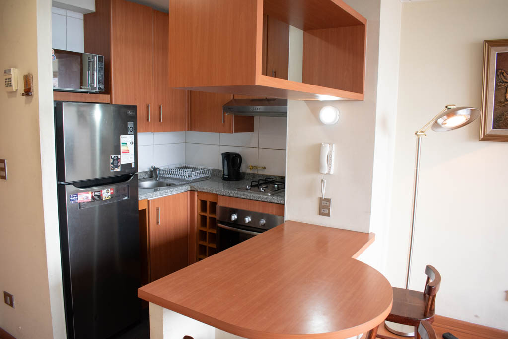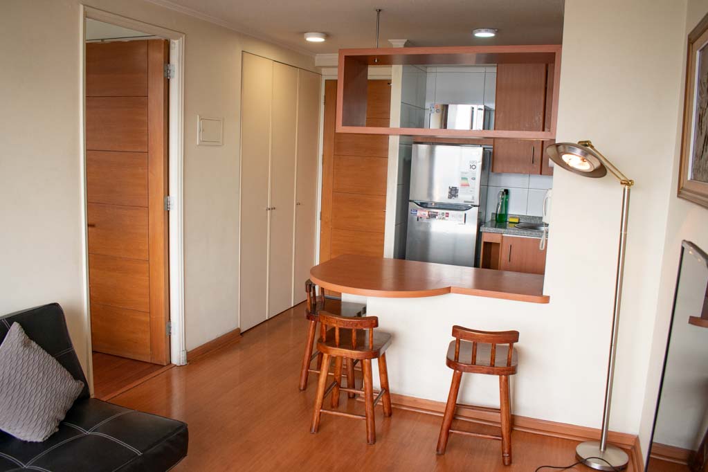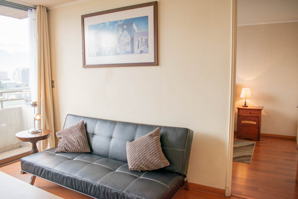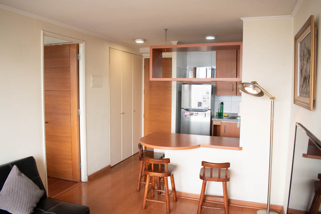Departamento amoblado de 1 habitación ubicado a 1 minuto caminando de la parada de autobús y a 5 minutos caminando de la Estación de Metro Bellas Artes.El departamento tiene living, comedor, cocina (abierta), 1 baño y balcón. La habitación 1 tiene cama matrimonial, 2 clósets, 2 mesas de noche y baño en suite; El lugar mide 33m² + 2m² de terraza aproximadamente. Los gastos de servicios de gastos comunes, agua caliente, agua fría, electricidad y gas se pagan por adelantado junto a la renta mensual, con un límite de consumo de $ 136USD. El alojamiento tiene lavandería compartida cuyo valor es $ 1USD aproximadamente por carga de ropa (lavado o secado). Se debe pagar garantía (depósito) la que será devuelta al finalizar el período de arriendo; además, se debe pagar $ 45USD al momento de devolver el alojamiento para realizar la limpieza del lugar. Cerca del alojamiento se encuentra el Barrio Lastarria y Barrio Bellas Artes (barrios históricos - culturales), caracterizados por sus casonas del siglo XIX restauradas y utilizadas como restaurantes, cafeterías, librerías, centros culturales, entre otros. A pasos podrás encontrar el Museo Nacional de Bellas Artes, donde se resguarda lo más valioso del arte nacional e internacional y el Parque Forestal, lugar ideal para compartir con amigos, practicar deportes y pasear.