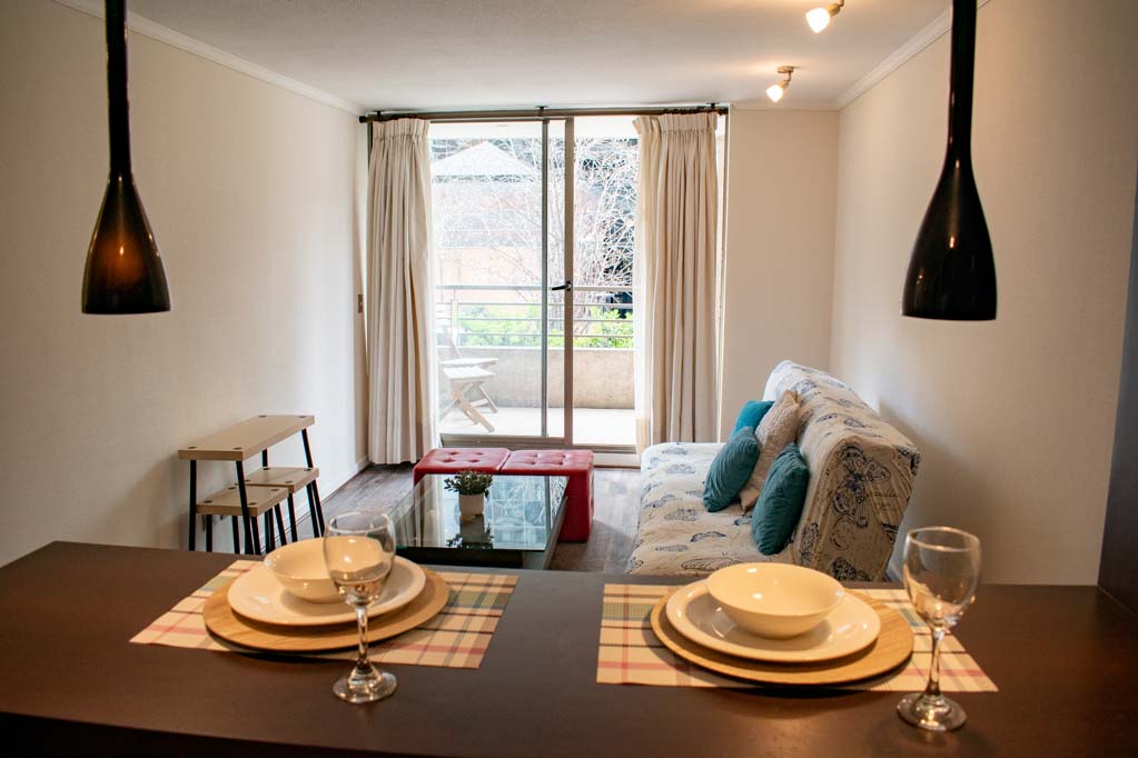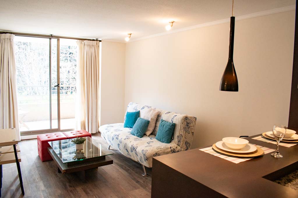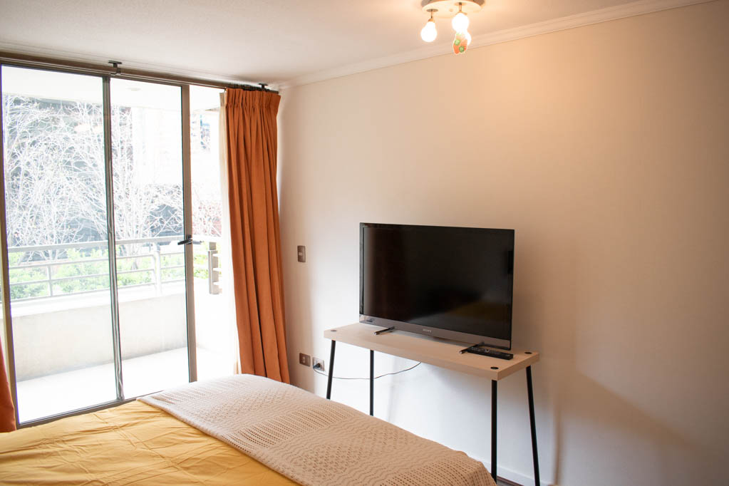 Departamento amoblado de 2 habitaciones ubicado a 1 minuto caminando de la parada de autobús.El departamento tiene living, cocina (abierta), 2 baños, terraza y 1 estacionamiento. La habitación 1 tiene cama matrimonial, walk-in clóset, mesa de noche, televisor y baño en suite; La habitación 2 tiene cama individual, clóset, mesa de noche y televisor; El lugar mide 65m² + 6m² de terraza aproximadamente. Los gastos de servicios de gastos comunes, agua caliente, agua fría, electricidad y gas se pagan por adelantado junto a la renta mensual, con un límite de consumo de $ 254USD. El alojamiento tiene lavandería compartida cuyo valor es $ 2USD aproximadamente por carga de ropa (lavado o secado). Se debe pagar garantía (depósito) la que será devuelta al finalizar el período de arriendo; además, se debe pagar $ 58USD al momento de devolver el alojamiento para realizar la limpieza del lugar. Cerca del alojamiento se encuentra gran cantidad de áreas verdes, galerías de arte, tiendas exclusivas y los restaurantes más elegantes de Santiago. Cerca podrás encontrar el Parque Bicentenario, 27 hectáreas de parque, especial para hacer deporte, disfrutar con familia o amigos de un picnic y observar lagunas artificiales con sus característicos cisnes de cuello negro, peces y algunos flamencos.