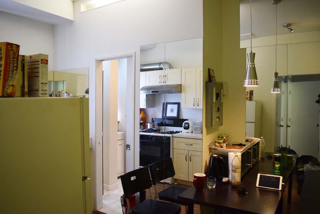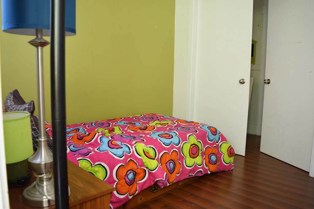 The unit has a shared living room, kitchen, and bathroom. The bedroom has a twin size bed, nightstand.
