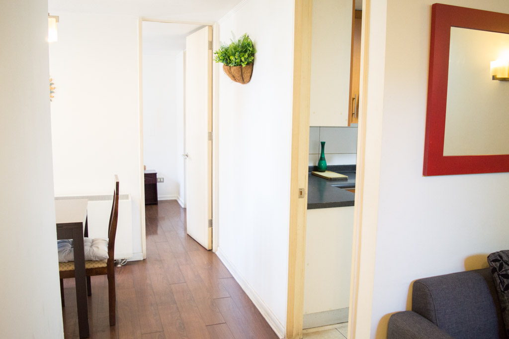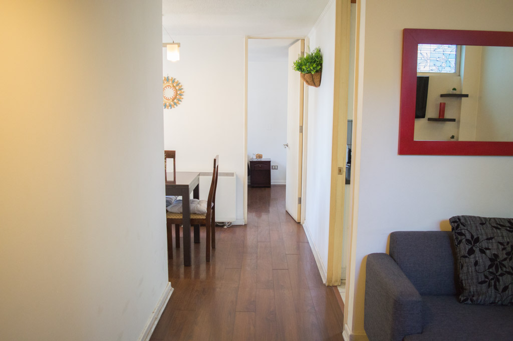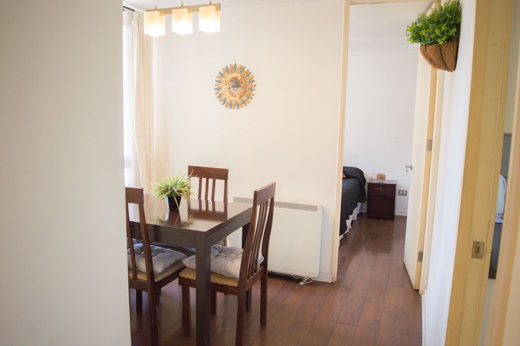Apartamento mobiliado de 1 dormitório localizado a 5 minutos caminhando da parada de ônibus e a 5 minutos caminhando da Estação de Metrô Toesca.O apartamento tem living, sala de jantar, cozinha (fechada) e 1 banheiro. O quarto 1 tem cama de casal, walk-in clóset, mesa de cabeceira e banheiro privado. O lugar mede aproximadamente 40m². Deve ser considerado, o pagamento das despesas de serviços de condomínio, água quente, água fria e eletricidade que somam $ 100USD aproximadamente. O imóvel tem lavanderia cujo valor é $ 2USD aproximadamente por carga de roupa (lavagem e secagem). Você deve pagar depósito de segurança, que será devolvido no final do período de locação; Também deve pagar $ 33USD ao momento de devolver o imóvel para a limpeza do lugar. Próximo ao imóvel está o Palacio Cousiño, um monumento nacional e um dos museus mais importantes de Santiago; ele está dentro do Parque Almagro, 12 hectares do parque, onde você também pode ver várias esculturas; a igreja dos Sacramentinos, entre outras atrações.