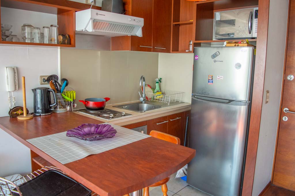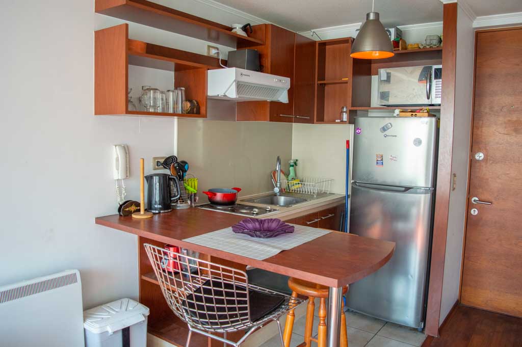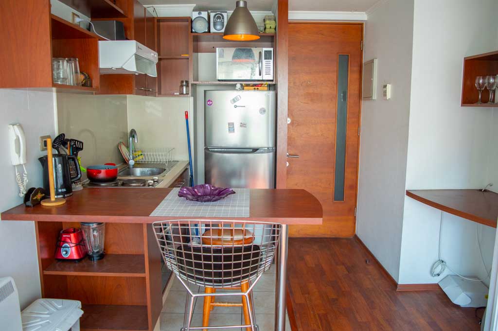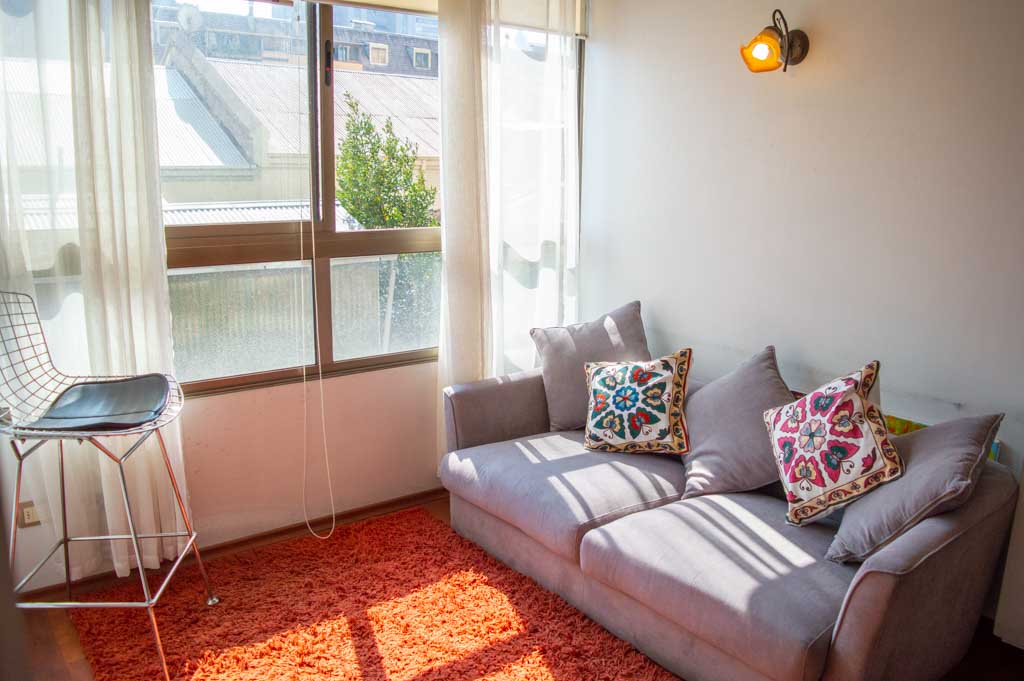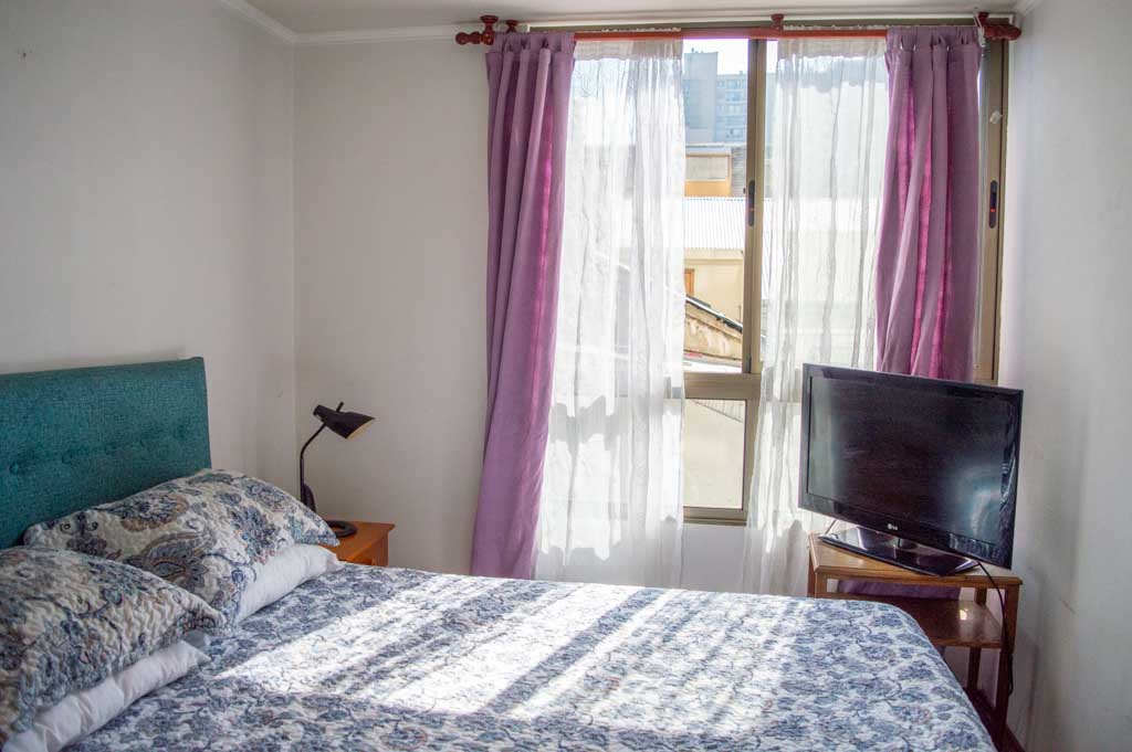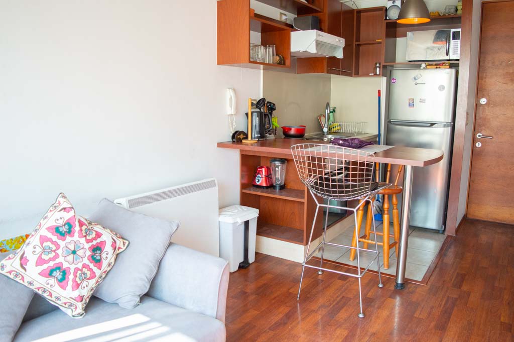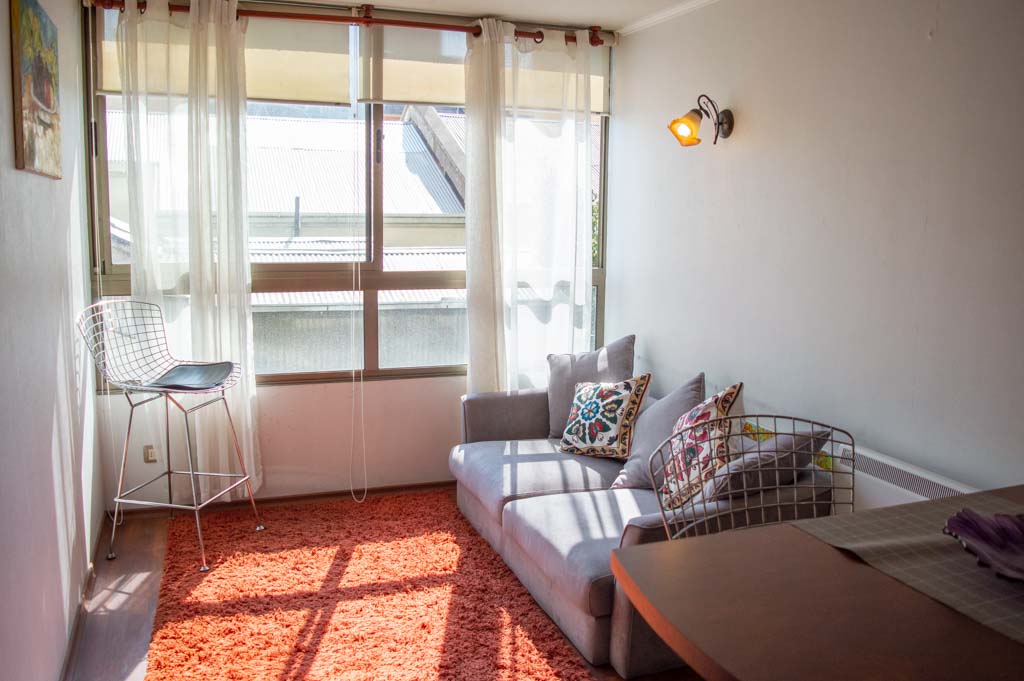 Apartamento mobiliado de 1 dormitório localizado a 1 minuto caminhando da parada de ônibus e a 5 minutos caminhando da Estação de Metrô Parque Bustamante.O apartamento tem living, sala de jantar, cozinha (aberta) e 1 banheiro. O quarto 1 tem cama de casal, closet, 2 mesas de cabeceira, TV e banheiro privado. O lugar mede aproximadamente 33m². Deve ser considerado, o pagamento das despesas de serviços de condomínio, água quente, água fria e eletricidade que somam $ 88USD aproximadamente. O imóvel tem lavanderia cujo valor é $ 1USD aproximadamente por carga de roupa (lavagem e secagem). Você deve pagar depósito de segurança, que será devolvido no final do período de locação; Também deve pagar $ 22USD ao momento de devolver o imóvel para a limpeza do lugar. Próximo ao imóvel está o Parque Bustamante, uma das mais importantes áreas verdes da cidade de Santiago, ideal para caminhadas, ciclismo e compartilhar com os amigos ou com a família. Perto está a Universidade Católica, Universidade do Chile e café literário, onde pode encontrar uma variedade de livros para ler no mesmo lugar, acompanhados por um café. Apenas a 10 minutos do parque, está o famoso bairro de Bellavista.